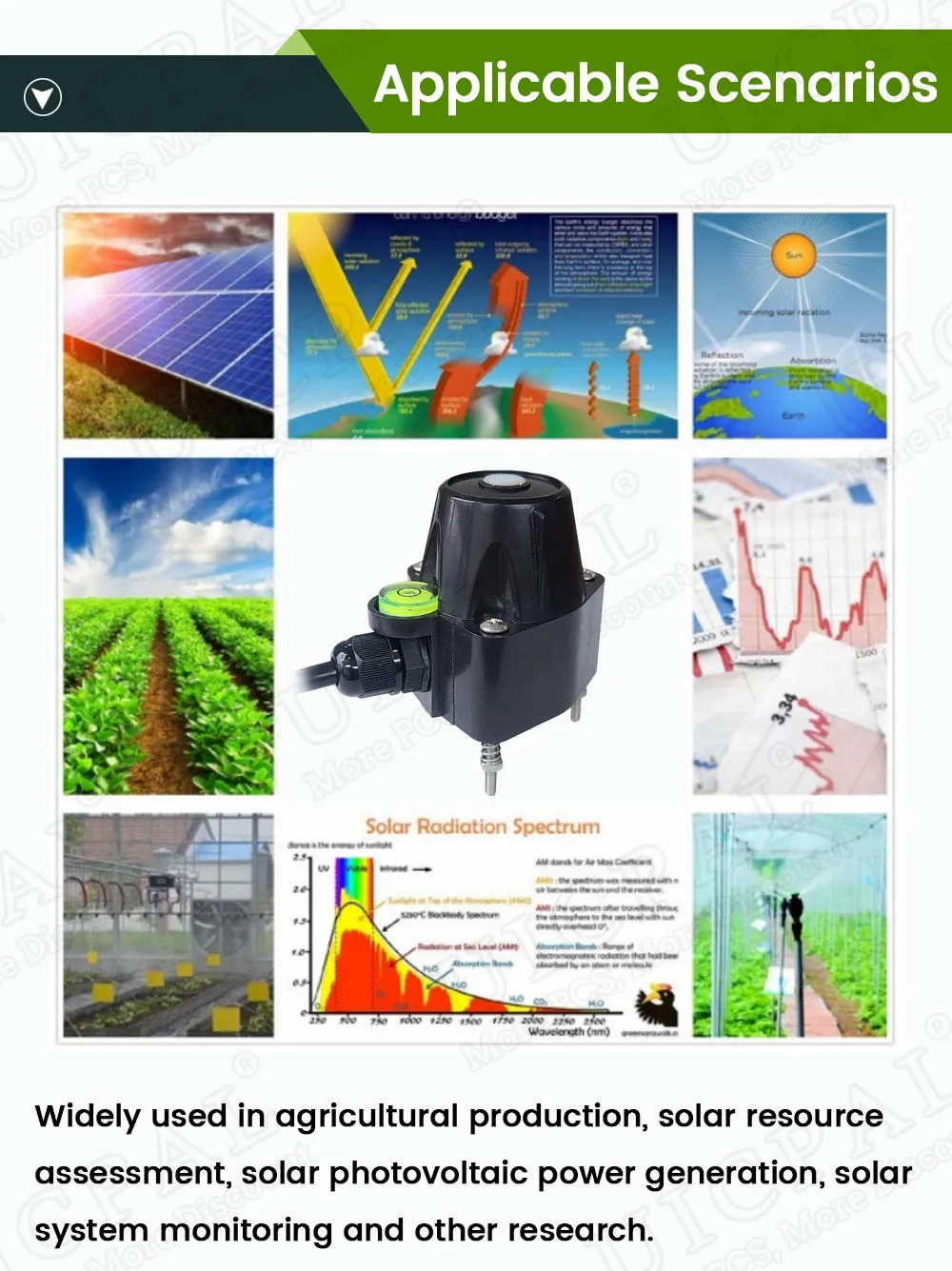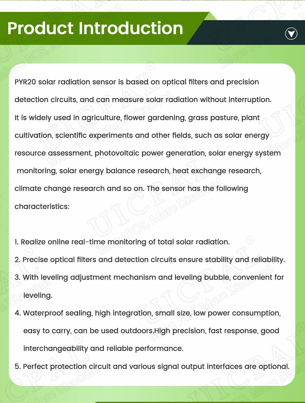 The PYR 20 solar radiation sensor is based on optical filter and precision detection circuit, which can measure solar radiation continuously. Widely used in agriculture, flower gardening, grassland pasture, plant cultivation, scientific experiments and other fields, such as solar energy resource assessment, photovoltaic power generation, solar system monitoring, solar energy balance research, heat exchange research, climate change research.