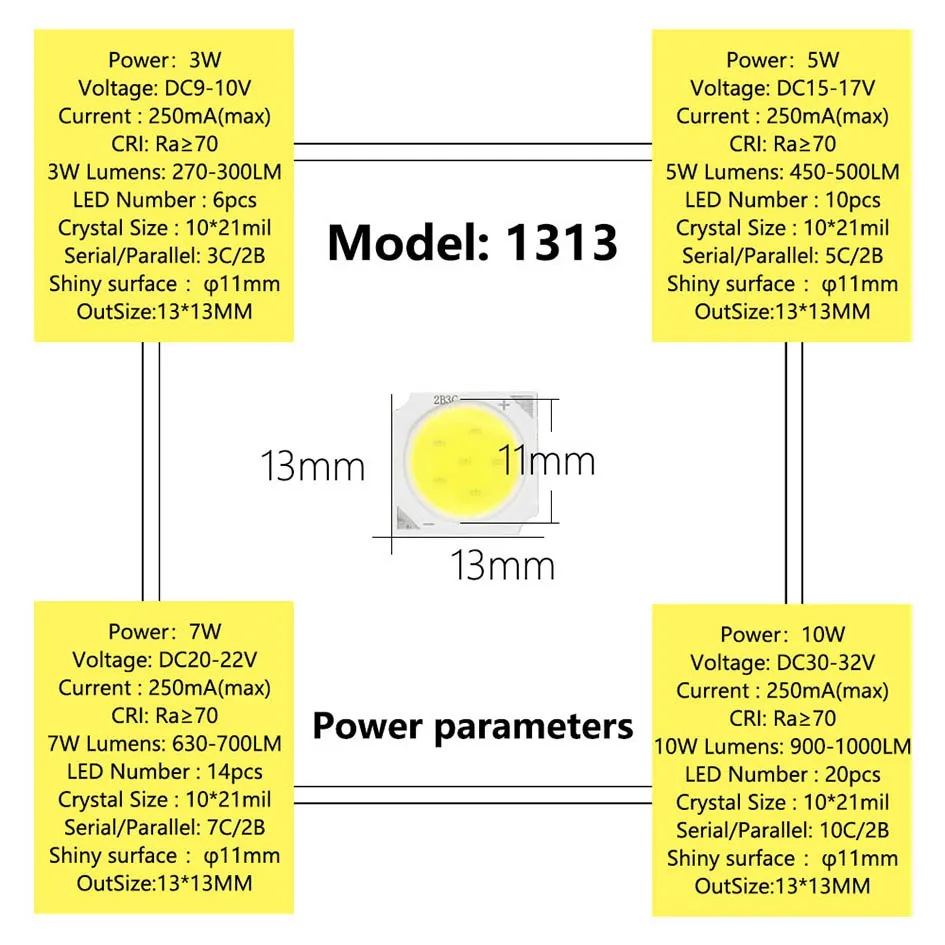 Product detailsModel: 1313Model: 1313Power:3W/5W/7W/10WCRI: Ra≥70Crystal Size : 10*21milShiny surface :φ11mmOutSize:13*13mmLED Voltage and Current: 3W…