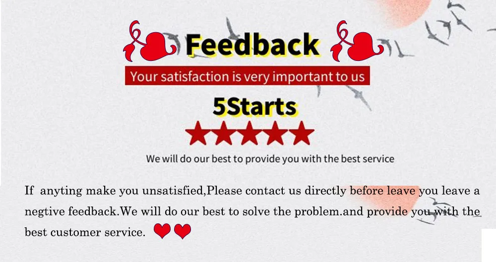 Your satisfaction and positive feedback is very import to us .Please leave positive feedback and 5 stars if you are satisfied with our items and services.If you believe you have any problems with our items or service,please feel free to contact us first before you leave negtive feedback.We will do our best to solve any problem and provide you with the best customer service.
