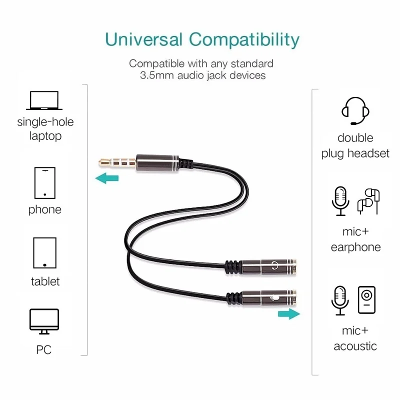 Turns a 3.5mm combo headphone/microphone port into two distinct ports - one 3.5mm headphone jack and one 3.5mm microphone port.