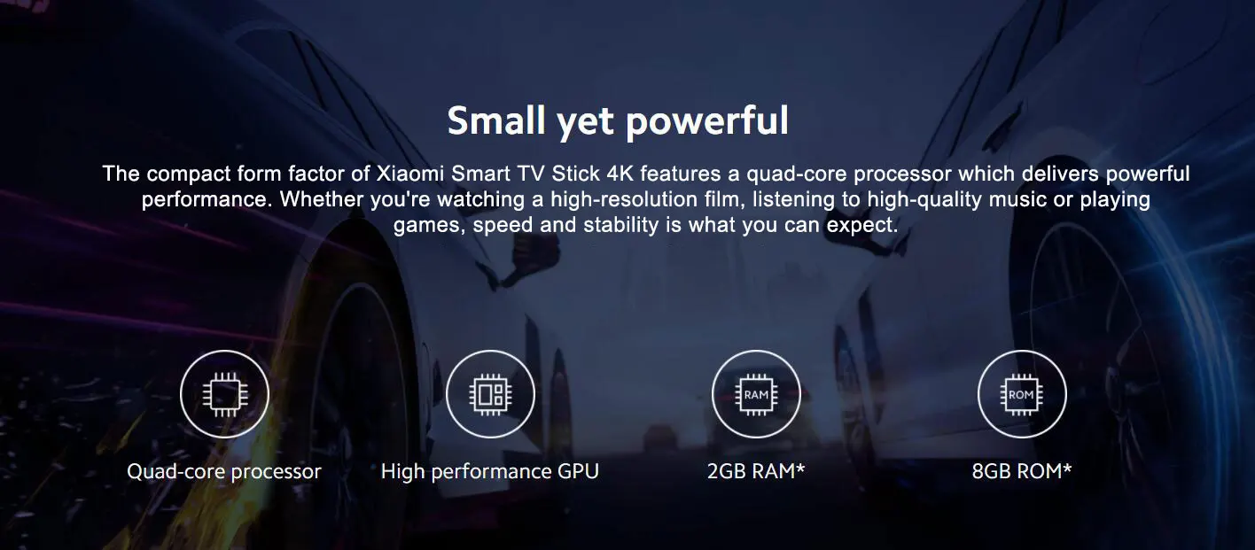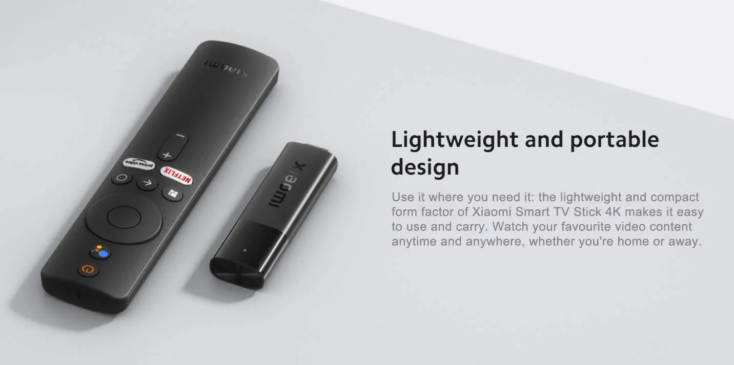 The compact form factor of Xiaomi Smart TV Stick 4K features a quad-core processor which delivers powerful performance. Whether you're watching a high-resolution film, listening to high-quality music or playing games, speed and stability is what you can expect.
