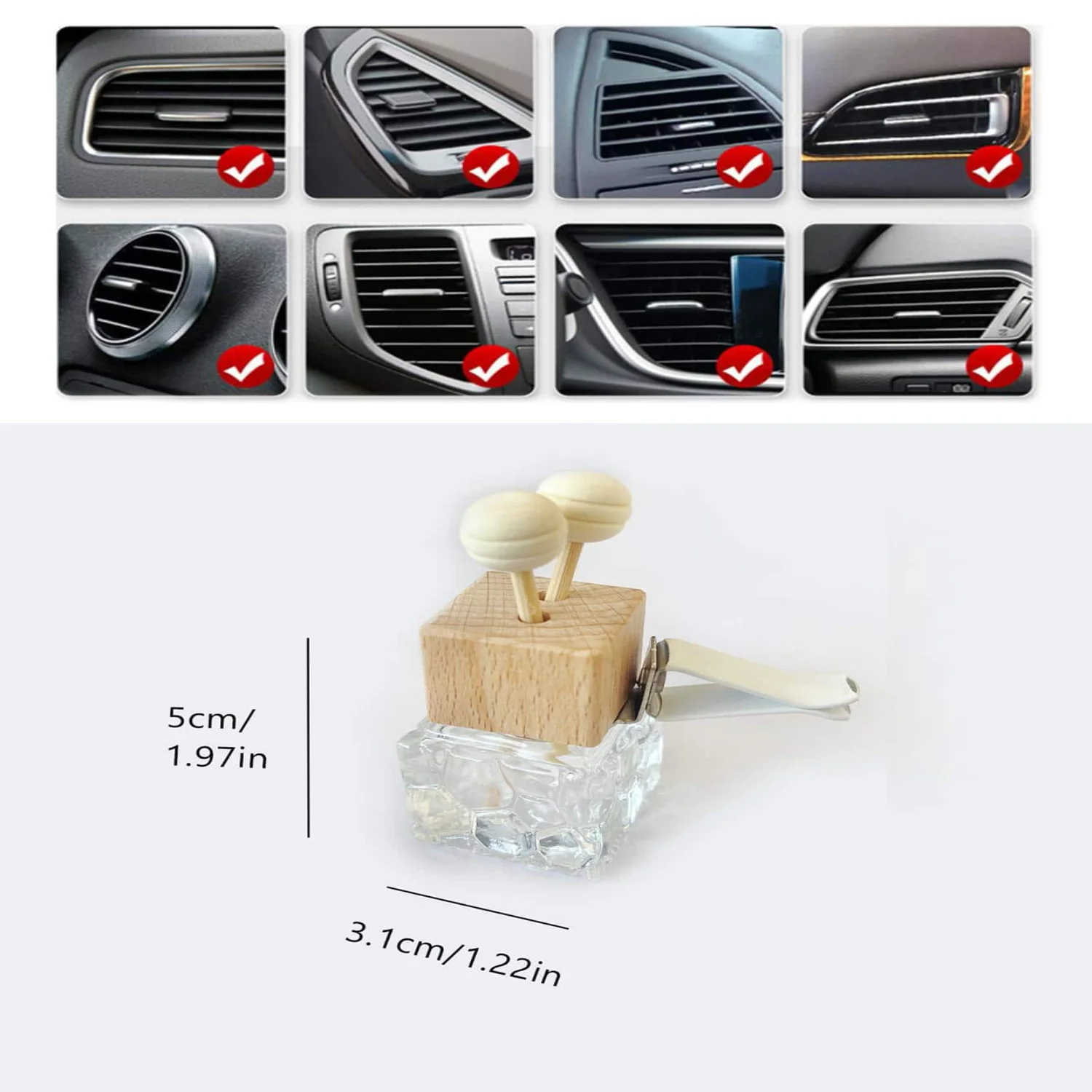 1. These 2pcs Car Air Vent Perfume Empty Bottles are the perfect decorative addition to any vehicle, with a clear design that allows you to see the 8ml perfume inside.