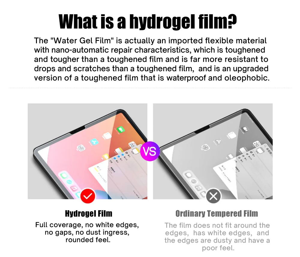 The "Water Gel Film" is actually an imported flexible material with nano-automatic repair characteristics, which is toughened and tougher than a toughened film and is far more resistant to drops and scratches than a toughened film, and is an upgraded version of a toughened film that is waterproof and oleophobic.