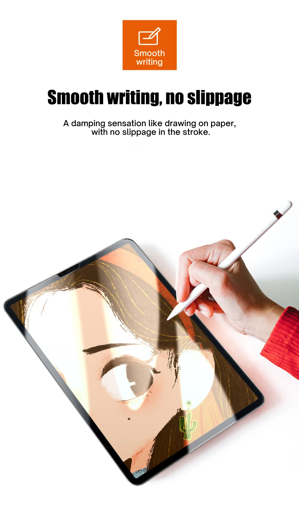 A damping sensation like drawing on paper, with no slippage in the stroke.