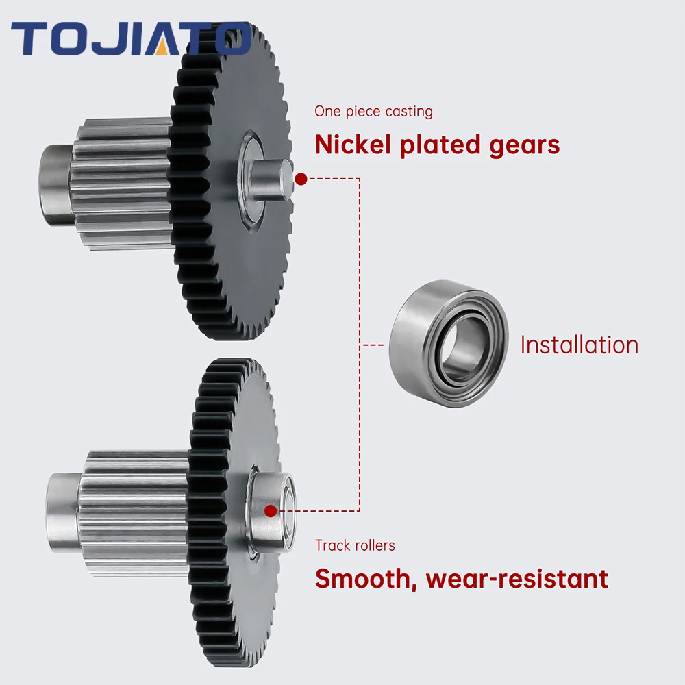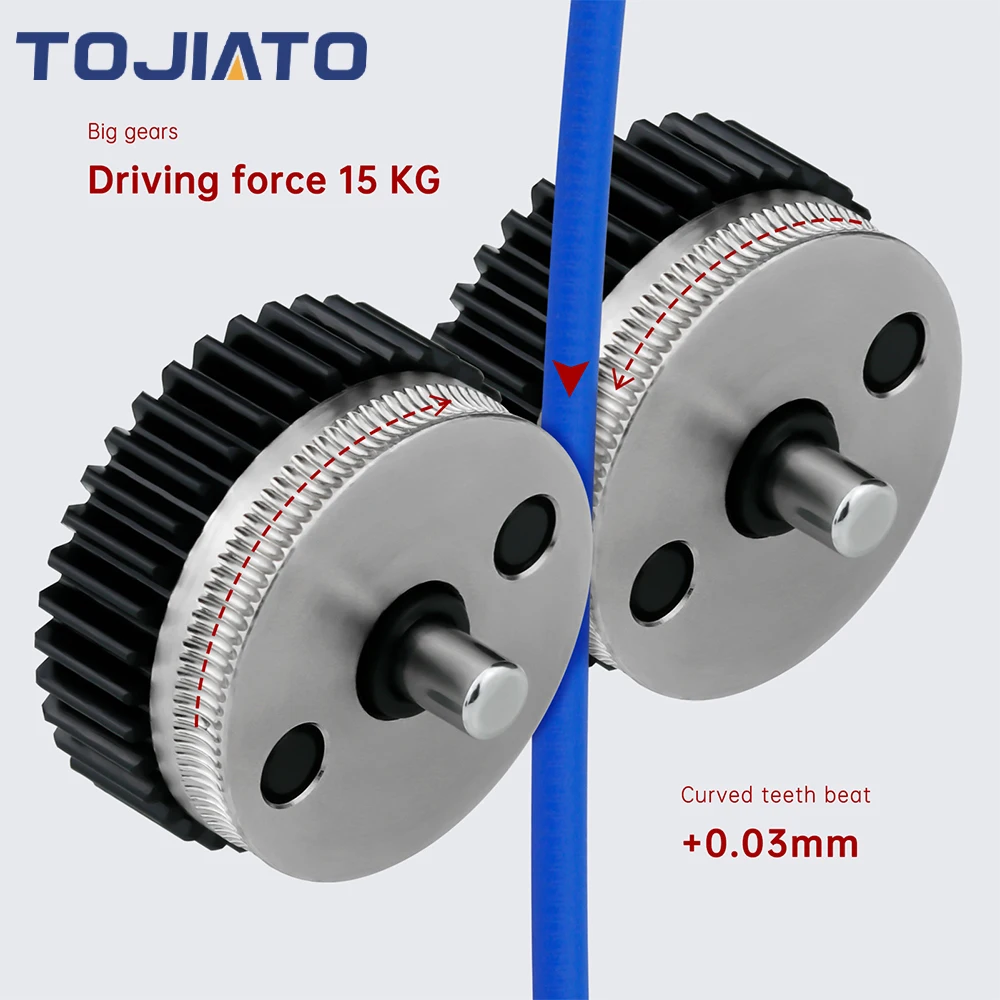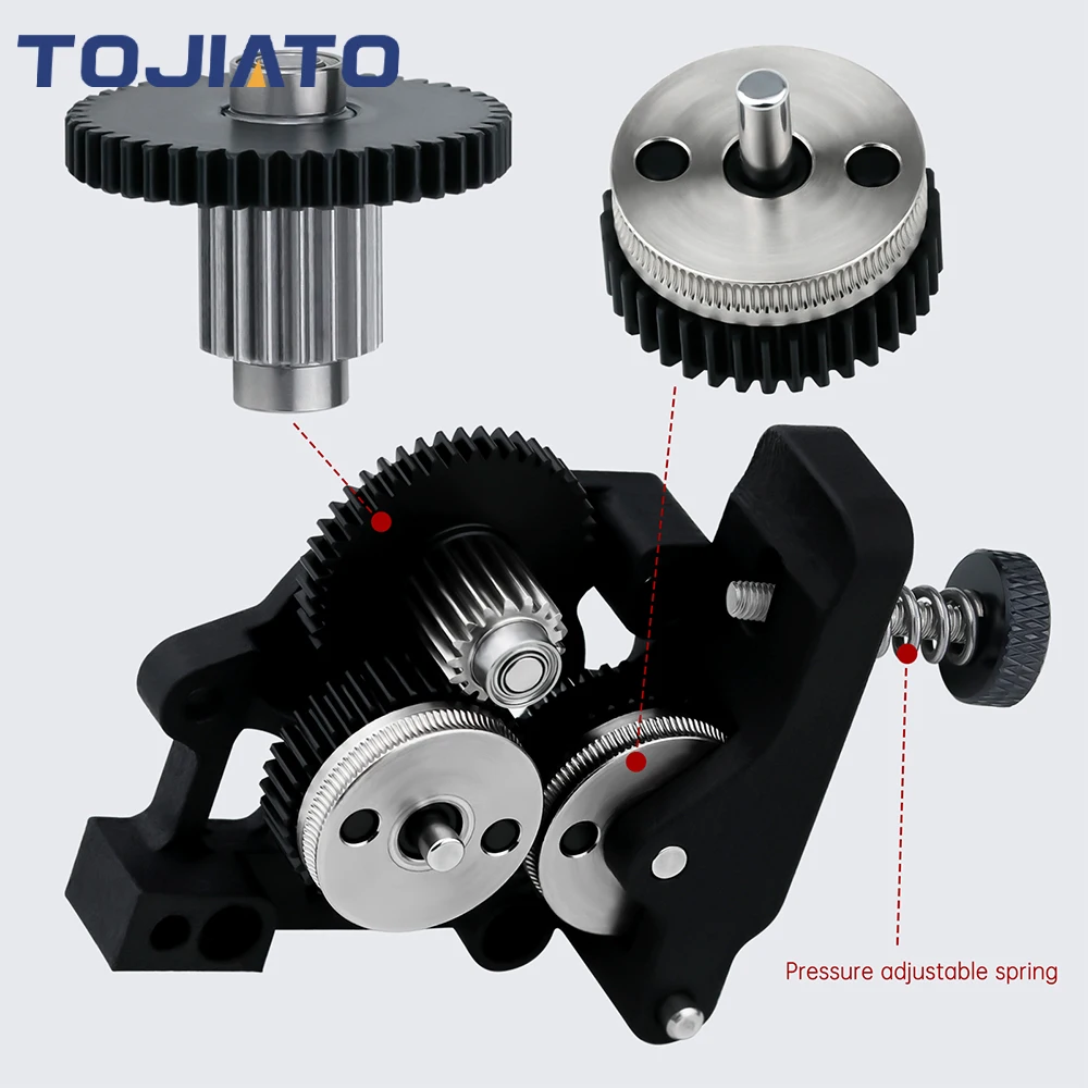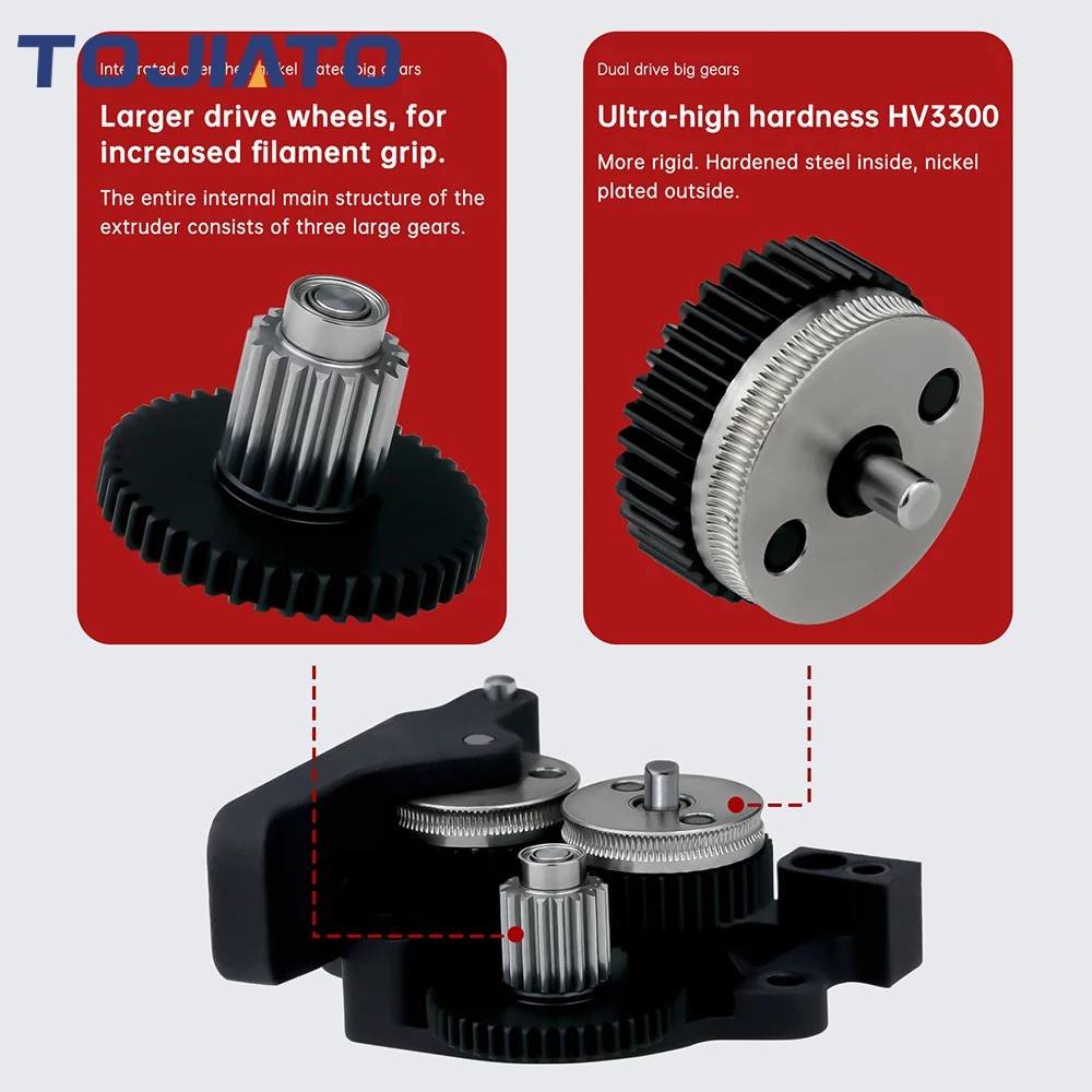 Integrated quenched nickel plated big gears.Larger drive wheels, for increased filament grip..The entire internal main structure of the extruder consists of three large gears.