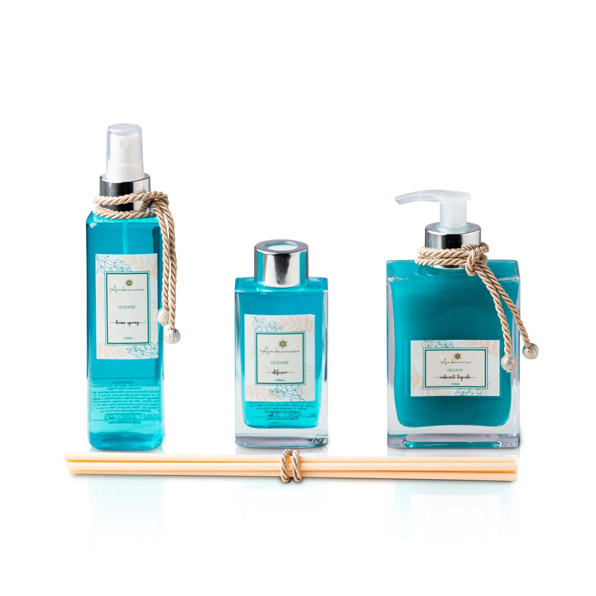 The Liquid soap Ambiencier Has the best extract for moisturizing and cleaning your skin, beyond the aroma soft and lightweight texture that ensure your satisfaction. TheLine OceaneIncludes the absolute sleeve pink, cedar and acqua. Tailored for you feel facing the sea, with foot chisel.