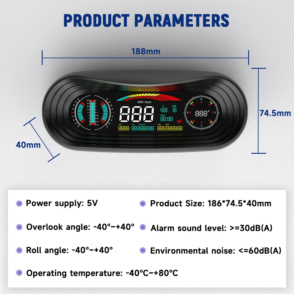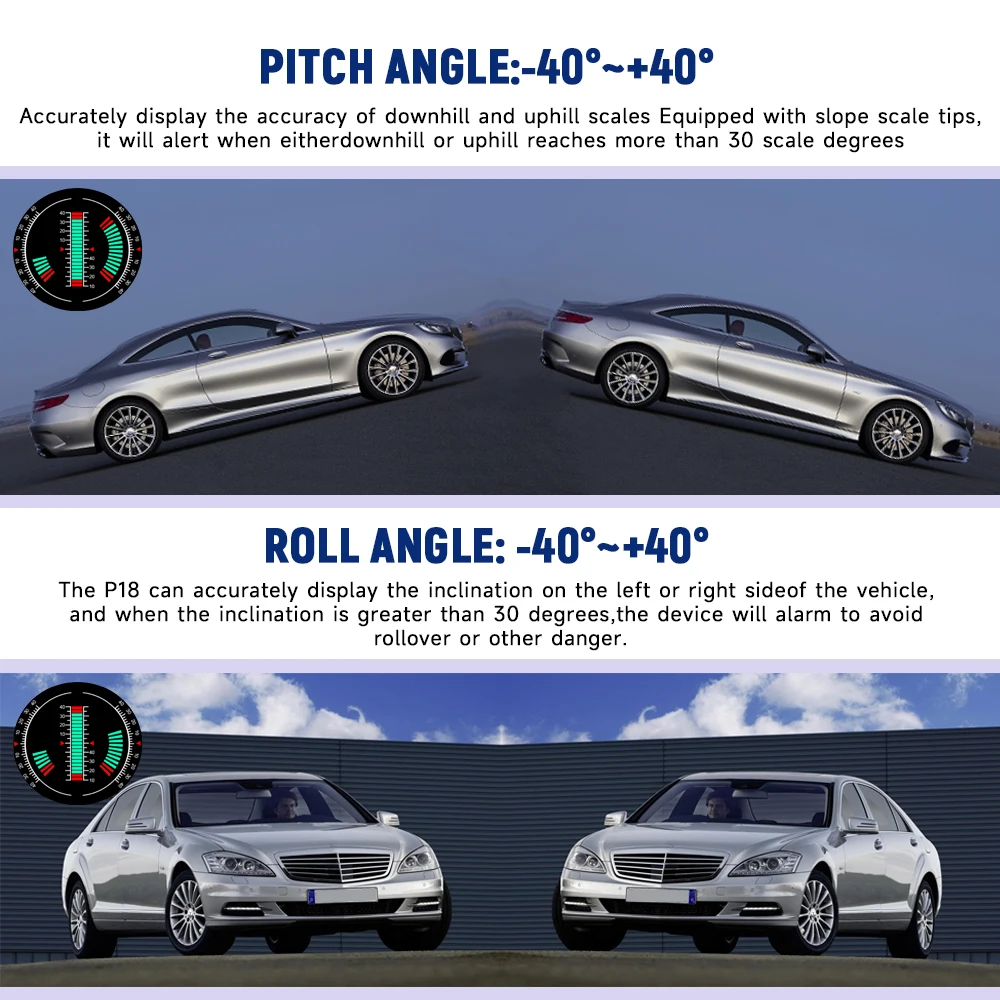 The P18 can accurately display the inclination on the left or right side of the vehicle, and when the inclination is greater than 30 degrees,the device will alarm to avoid rollover or other danger.