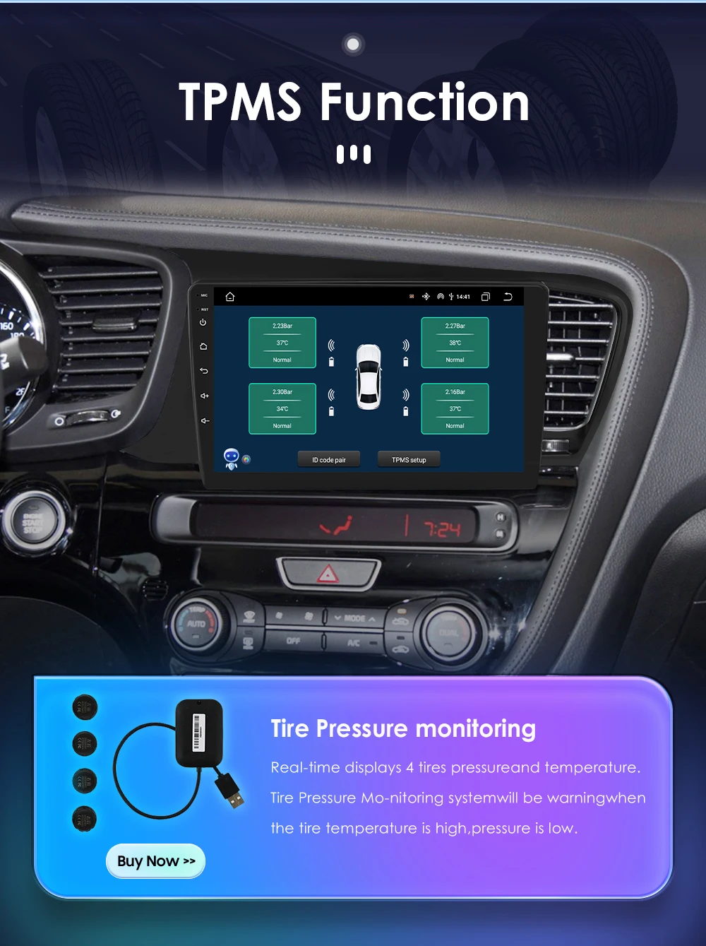 TPMS Function( Needs to order separately) : Tire Pressure Monitoring: Real-time displays 4 tires pressure and temperature,Tire Pressure Monitoring system will be warning when the tire temperature is high, pressure is low.