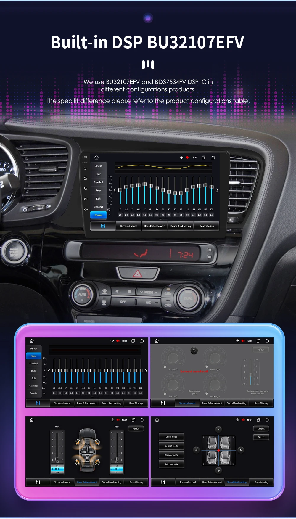 Built-in DSP BU32107EFV: We use BU32107EFV and BD37534FV DSP IC in different configurations products. The specifit difference please refer to the product configurations table.