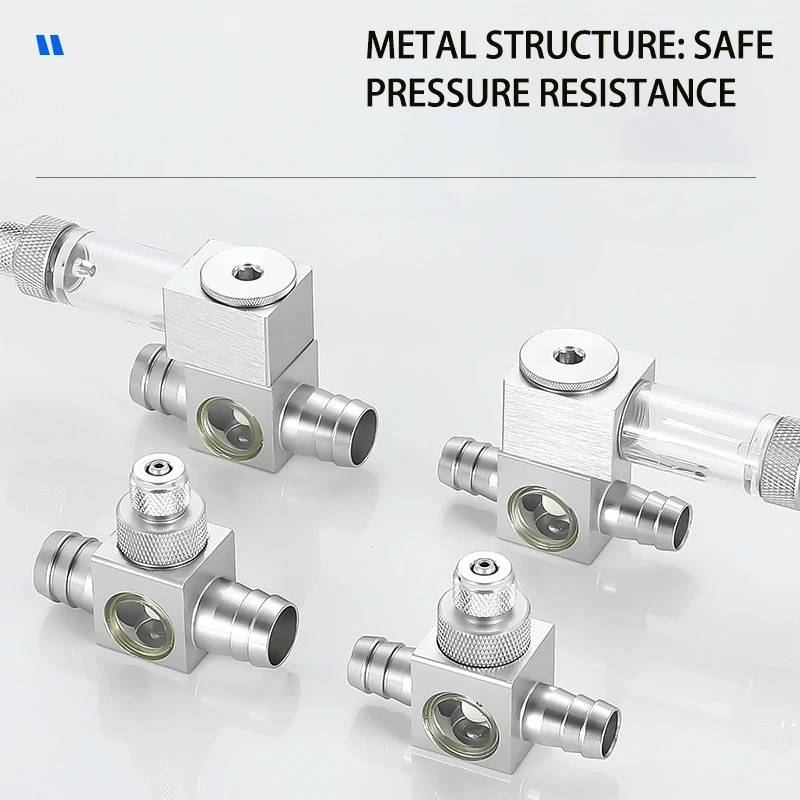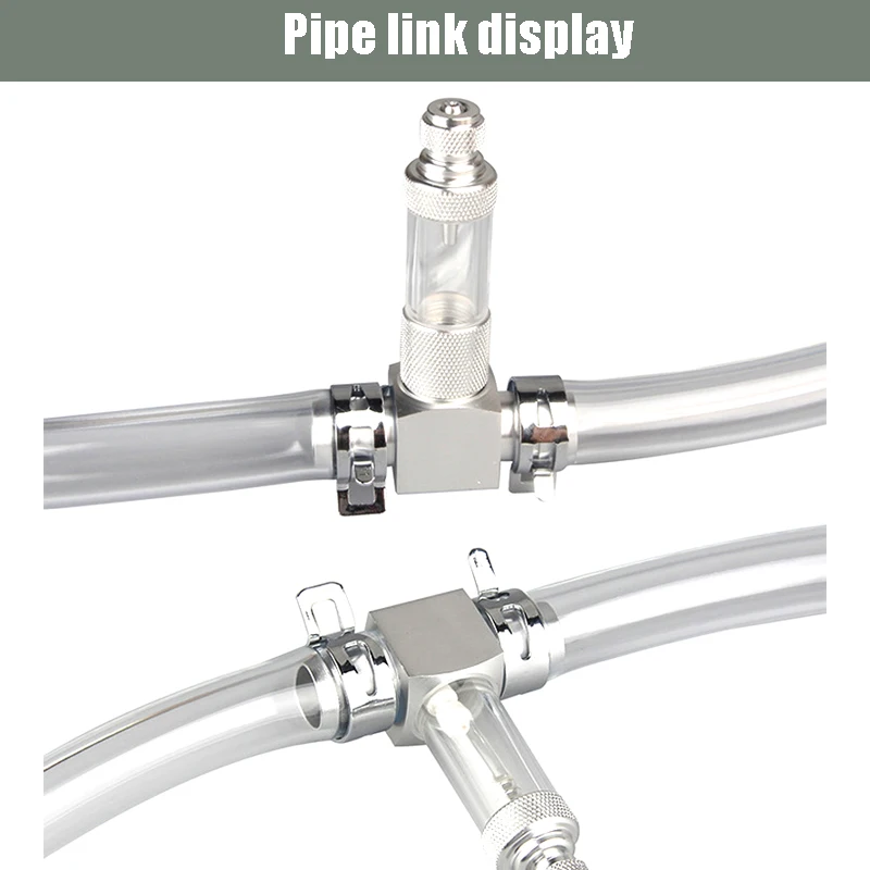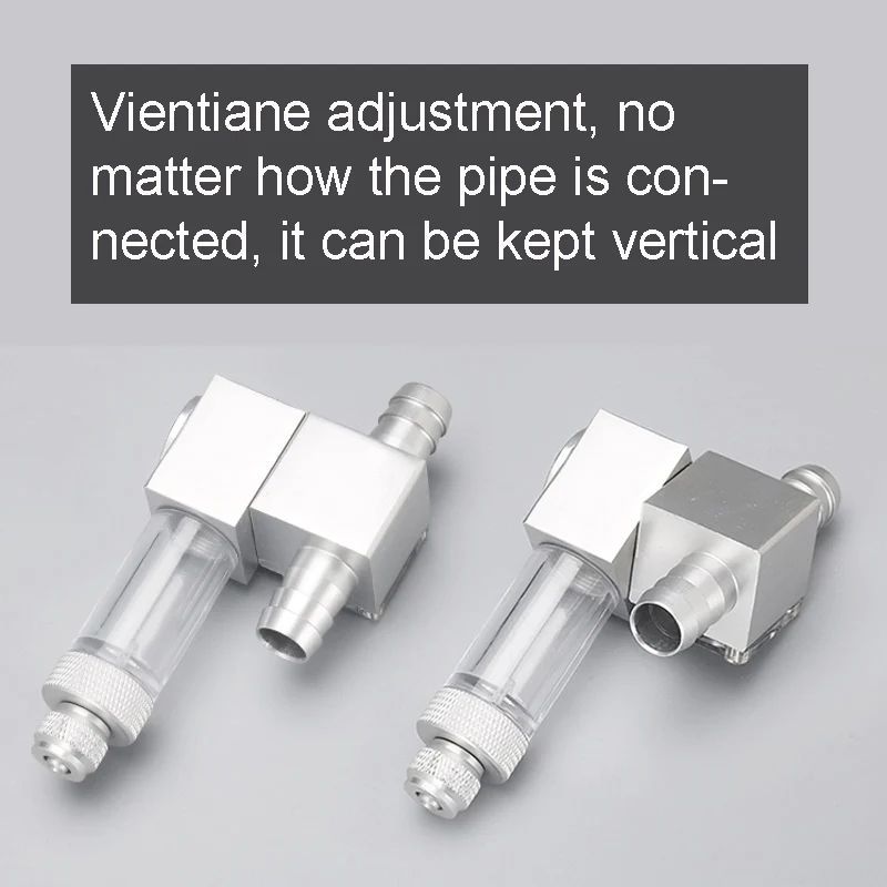 It is recommended to tilt the air pipe connection downward during installation. If the air pipe connection faces upwards and there is air inside the product, please loosen the metal cover of the acrylic glass and ventilate it slightly, and then tighten it immediately after ventilation.