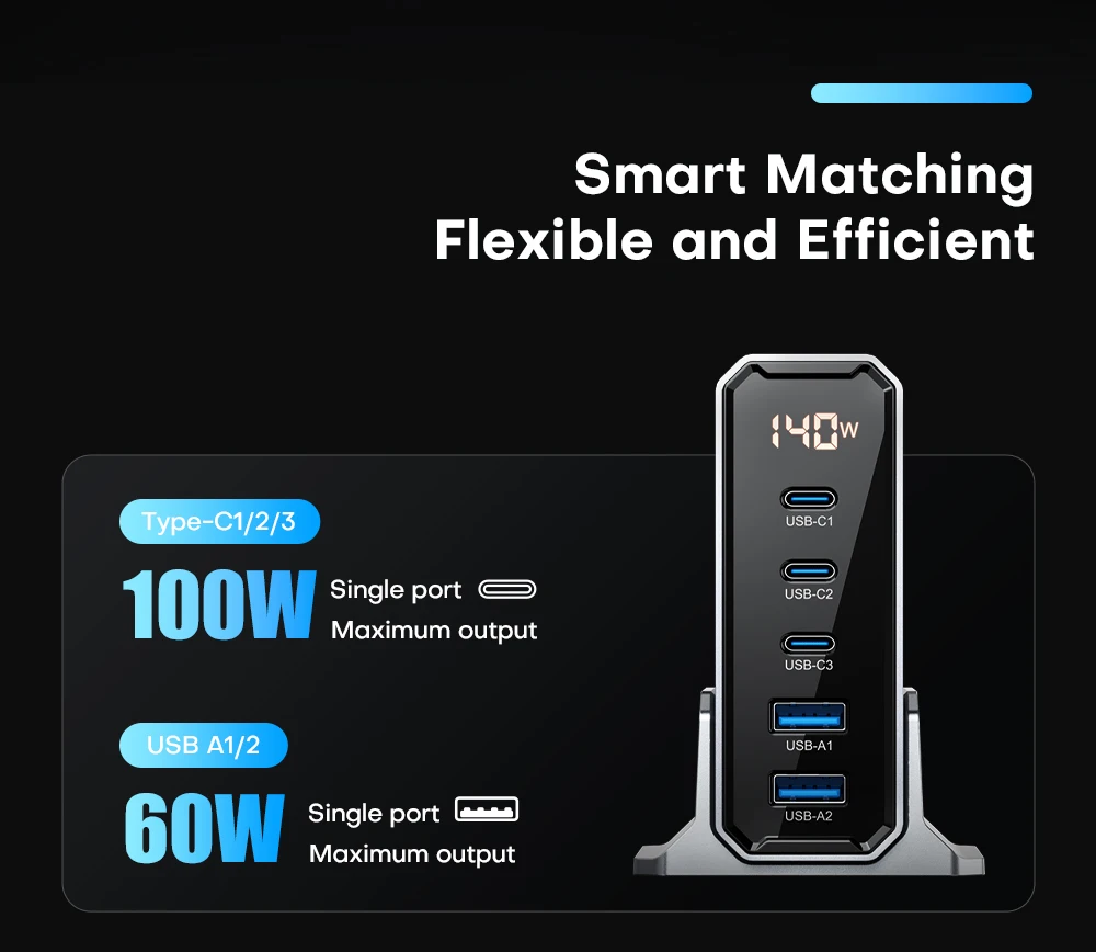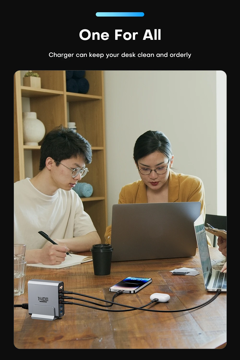 ?【5 in 1 USB C Charger】: This desktop USB C charger comes with 5 USB output ports and fast charging protocols such as PD3.0 QC4.0 QC3.0 PPS AFC FCP SCP SSCP for simultaneous fast charging of multiple devices. 3 USB-C ports and 2 USB-A ports share a total output of up to 140W. The cool thing is that you can fast charging 2 laptops at the same time, which could be the equivalent of having 2 pieces of 65W USB c charger.
