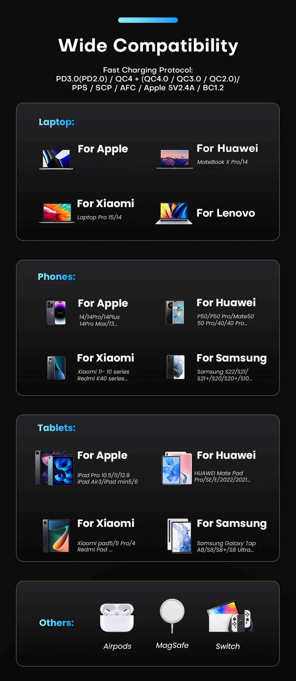 The fast charging capability of the charger is related to the model and software version of the device. Software upgrades of the device may affect the compatibility of the charger's fast charging. In actual use, the product will actually be compatible with more models, as there are too many models of devices, we can't give examples one by one, if you have questions, please contact us, we will be the first to answer them for you.
