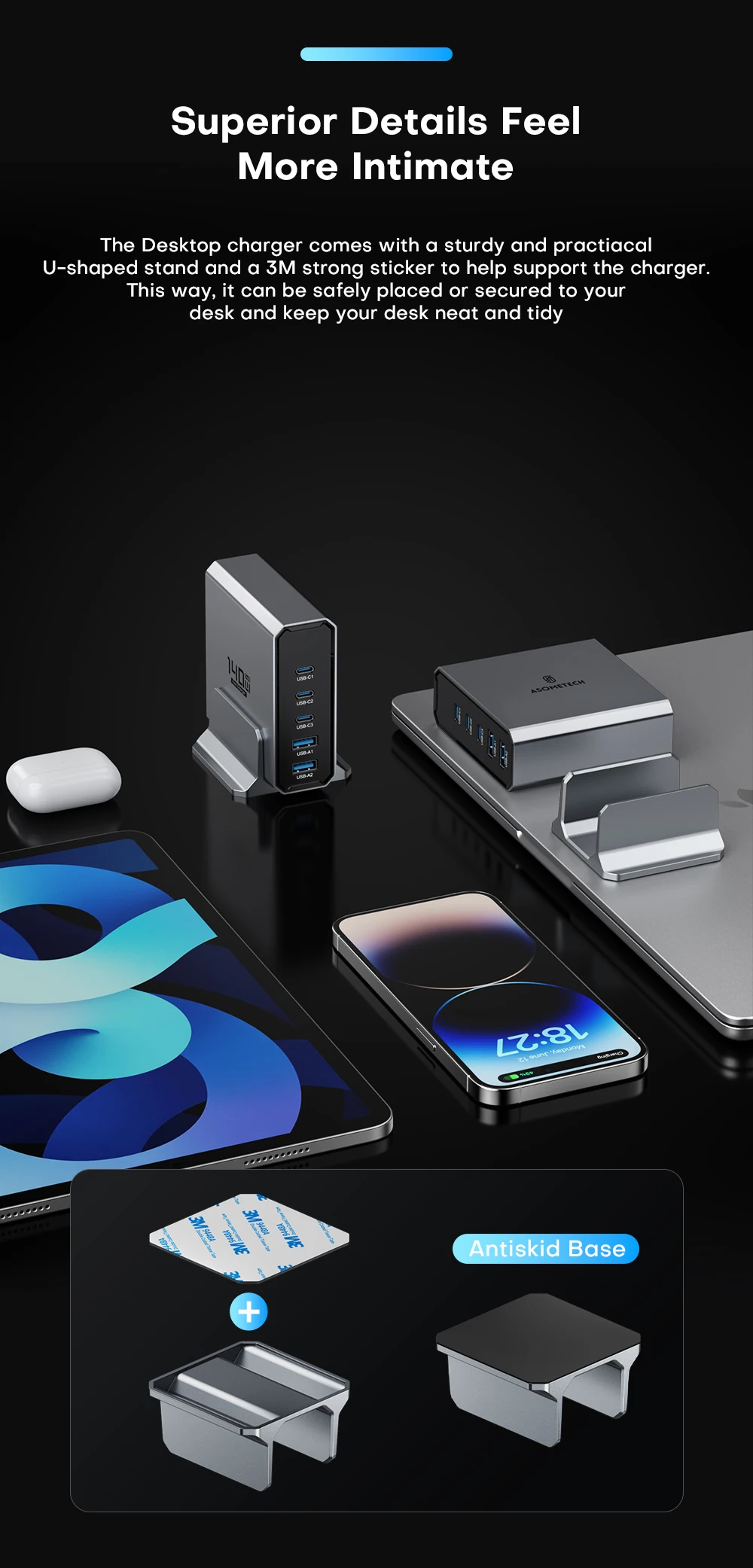 ?【Multi-port GaN technology】: desktop charger using new GaN technology support, we achieve multiple ports to support high power fast charging output and smaller size with safety in mind;