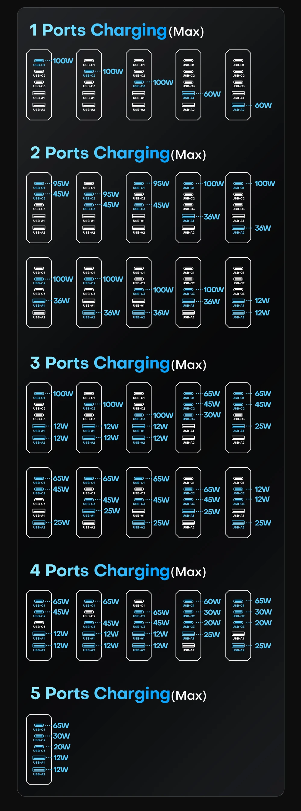 ?【Faster Power, Super Charging】: USB-C1/C2/C3 all support up to 100W PD PPS fast charging, via 100W USB-C to USB-C cable, MacBook Pro 15.4" charges from 0% to 100% in less than 2 hours, for iPhone 14 / Samsung S23 charges to 60% in 30 minutes. USB-A1/A2 supports up to 60W power output , supports QC3.0 FCP SCP SSCP and other fast charging protocols;