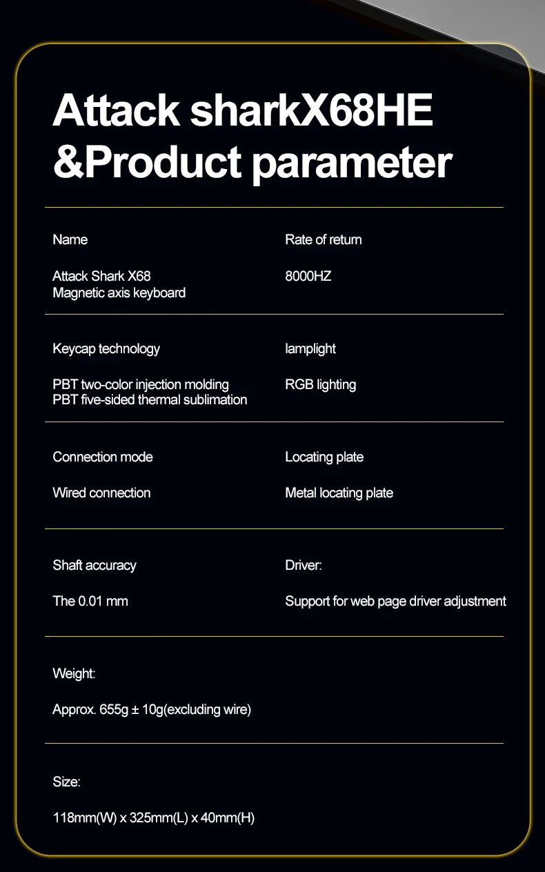 The entire X68 HE wired keyboard is equipped with fully adjustable Hall magnetic switch, enabling you to set every key’s actuation point from 0.1mm to 3.4mm in 0.01mm steps, putting you in control for fast keypresses or ultra-accurate typing.
