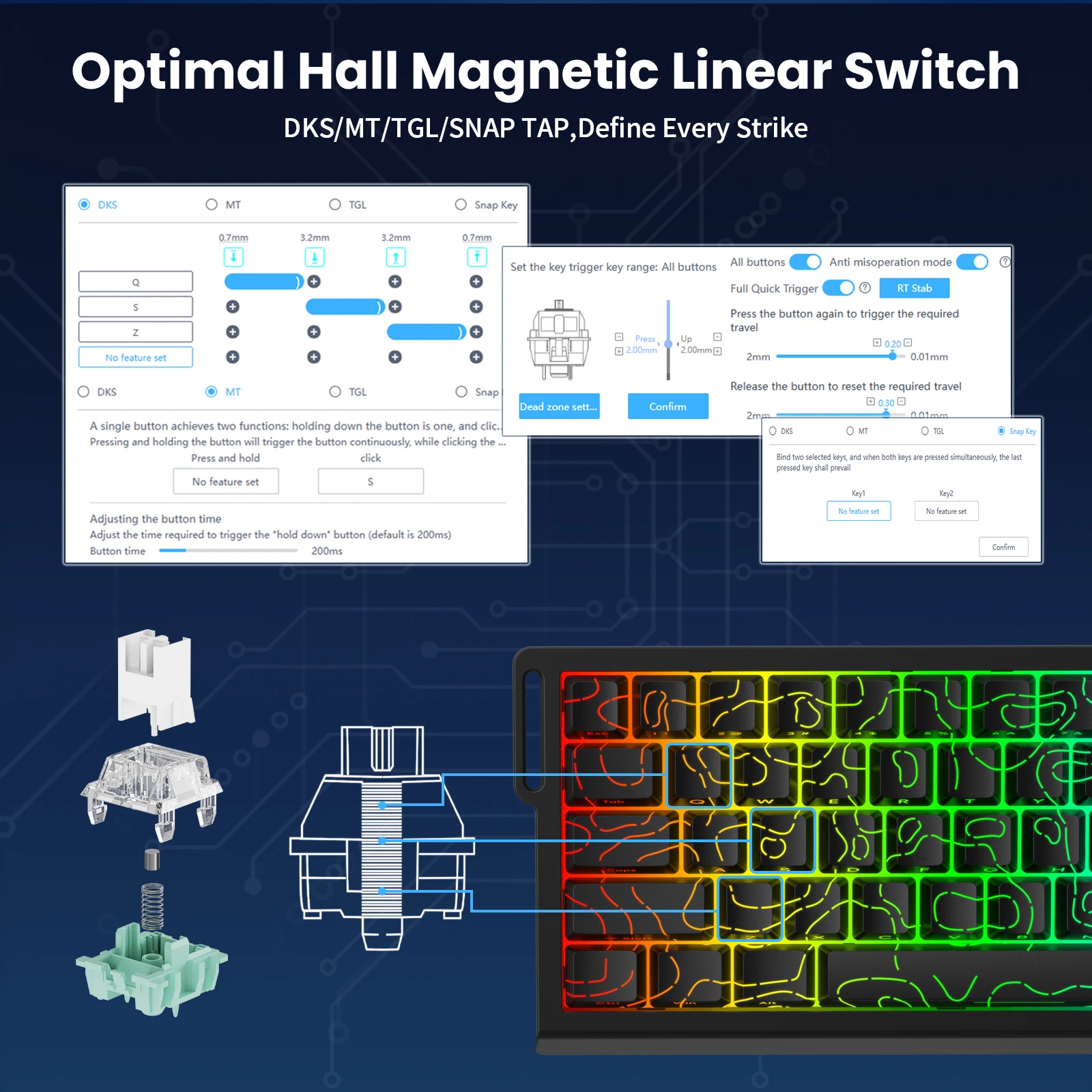 The web driver simplifies settings and parameter adjustments for both casual and advanced users. All system performance parameters are fully customizable, with real-time visual feedback, including per-key rapid-trigger/sensitivity on the keyboard preview.