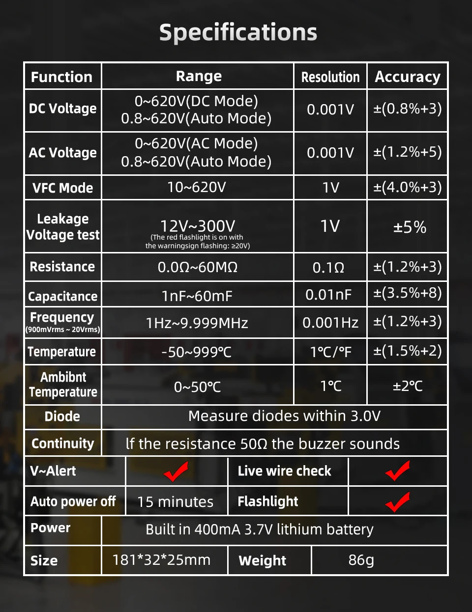 0-6.099V 0.001V ±(1.2%+5); 6.1-60.99V 0.01V ±(1.2%+5); 61-620V 0.1V ±(1.2%+5); 10-620V (VFC Mode) 1V ±(4%+3)