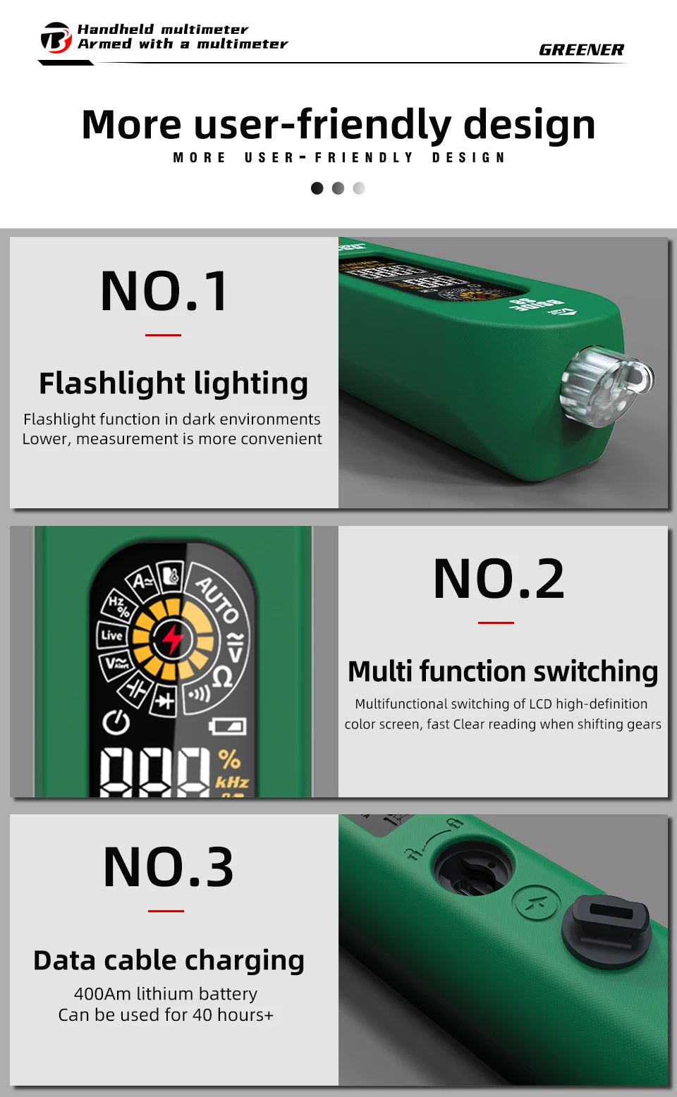 Auto range, Auto power off, low battery indication with flashlight design
