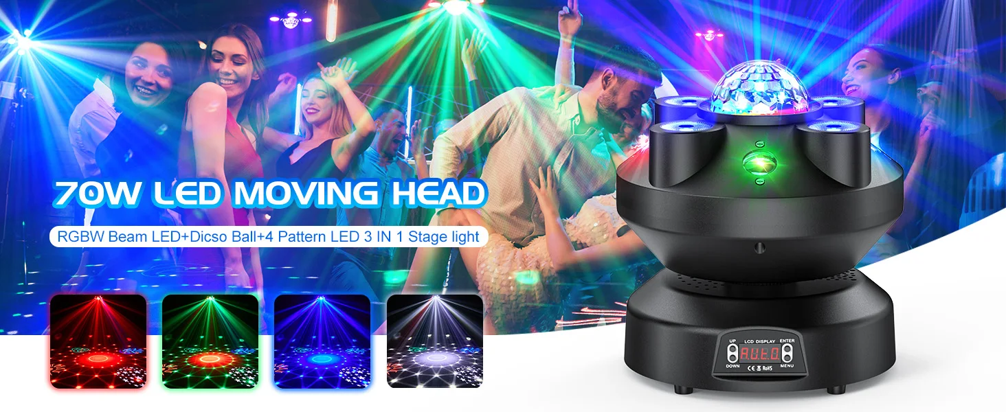 Specifications:Shell color:BlackMaterial:Plastic shellVoltage:AC95V-245V 50/60HzRated power: 70WLight source:1PCS 15W RGBW LED + 4PCS 12W RGBW LED + 4…