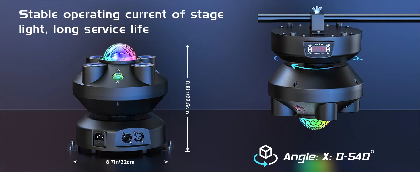 Product Description:The light stands out with its distinctive and dazzling magic ball design, offering a captivating visual spectacle through a range of colors and dynamic lighting effects. Its high-speed rotation and transformations create a mesmerizing atmosphere. Alongside the magic ball, the Dye Cyclone provides impressive color and pattern effects, covering the stage with vibrant hues and patterns for added depth. With user-friendly controls and an advanced system, users can easily personalize the lighting effects using a simple interface or professional console, adjusting colors, brightness, speed, and patterns in real-time to suit their performance requirements!