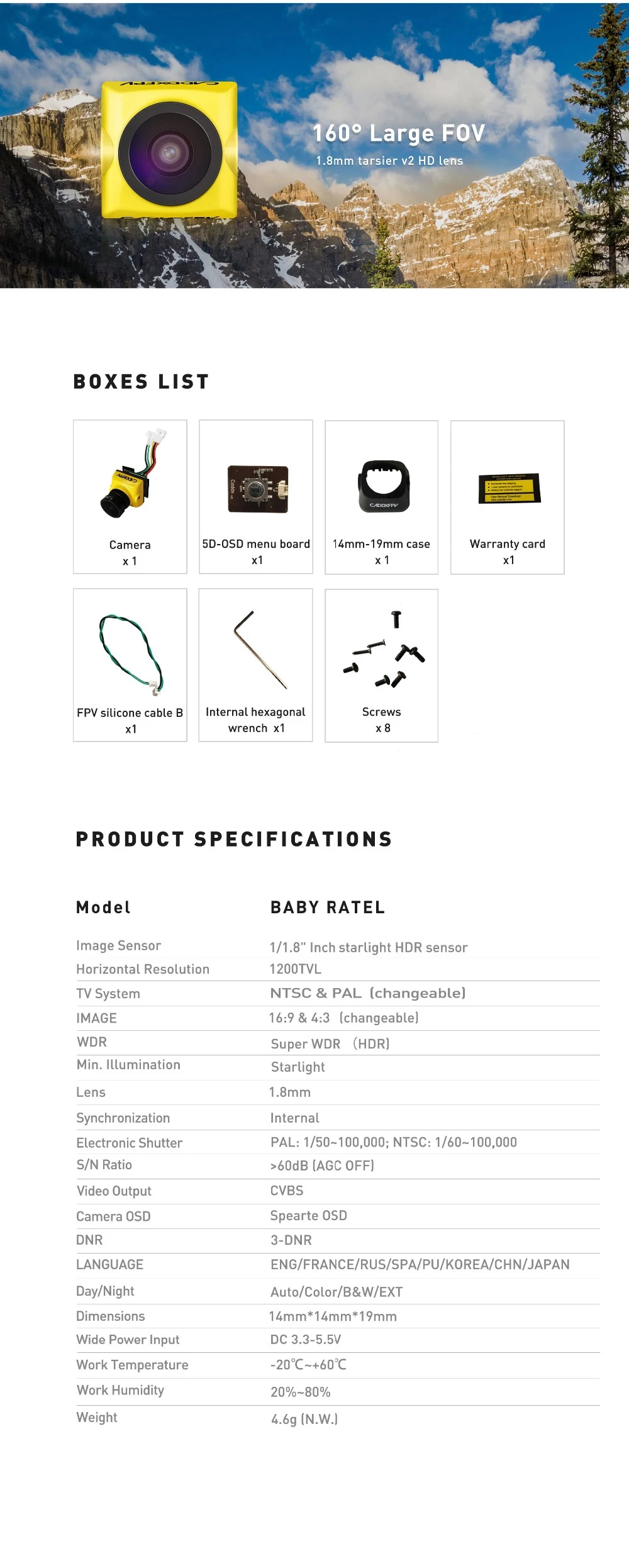 Specifications:Brand Name: CaddxItem Name: Ratel 2Sensor: 1/1.8'' Inch StarlightResolution: 1200TVLFOV: 165°Lens: 2.1mmTV System: NTSC &…