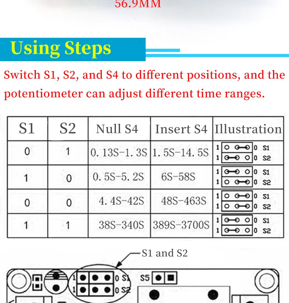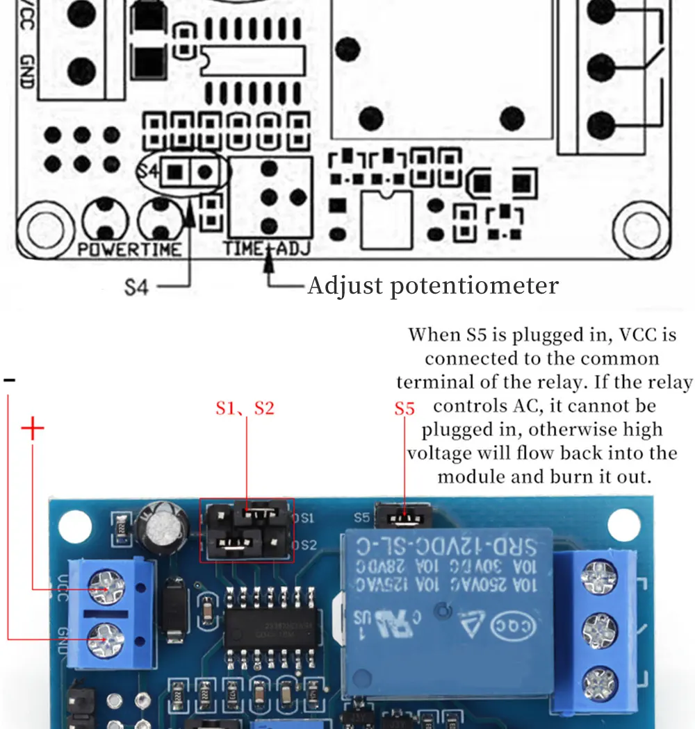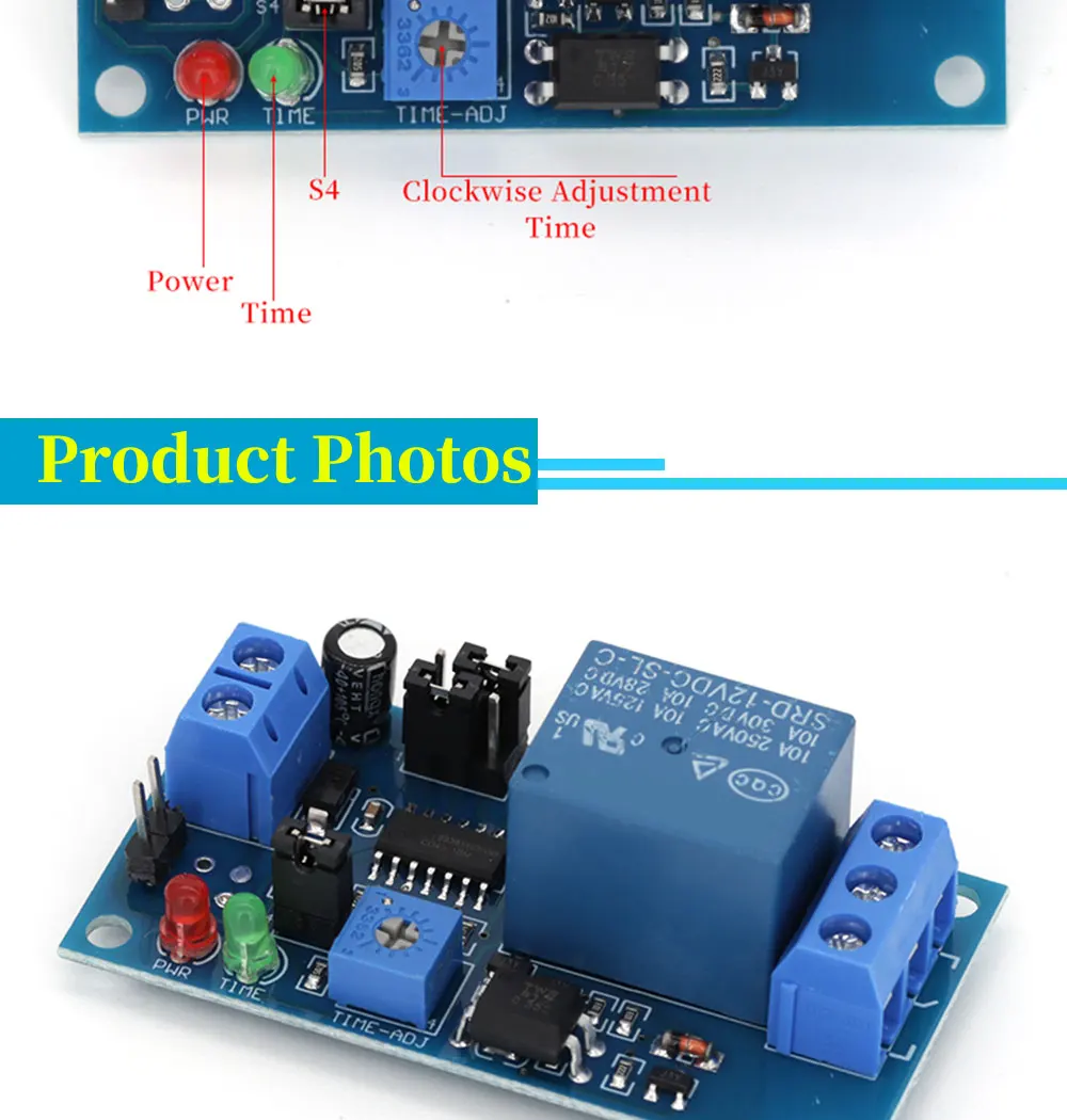 With 8 time ranges selected shortest 0.1s most up to 1 hour Protection against power reversal protection diode, better protection module Can be accessed by a large current load (250V ac 10A or 30V dc 10A) With delay adjustment potentiometer clockwise adjustment time longer.