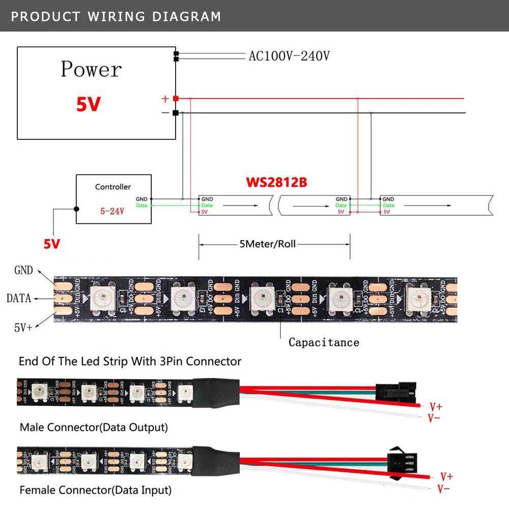 4. WS2812B Led Strip Work With DC5V,And it must need a WS2812B led controller to control it