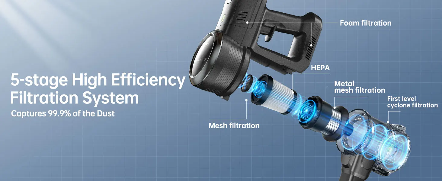 [High-Efficiency HEPA Filtration System for Cleaner Air] Our cordless stick vacuum cleaner features a 5-stage fully sealed cyclone filtration system, capturing 99.99% of dust particles as small as 0.1 microns. This advanced system ensures the release of ultimate purified air while effectively preventing secondary pollution, providing your family with fresher air. Remember to clean the HEPA filter regularly to maintain strong suction and avoid blockages. An extra HEPA filter is included for your convenience. The 1.2L dust cup capacity allows multiple cleaning sessions without frequent emptying, and our one-touch emptying feature eliminates the need to touch the dust.