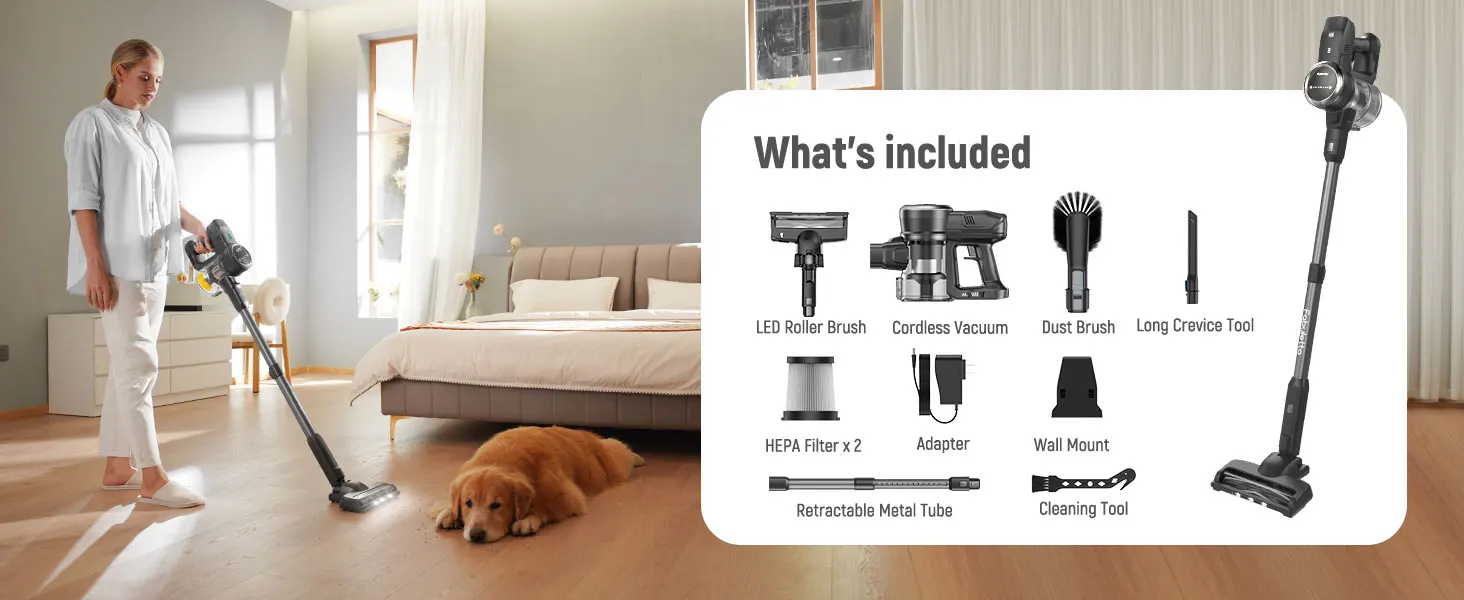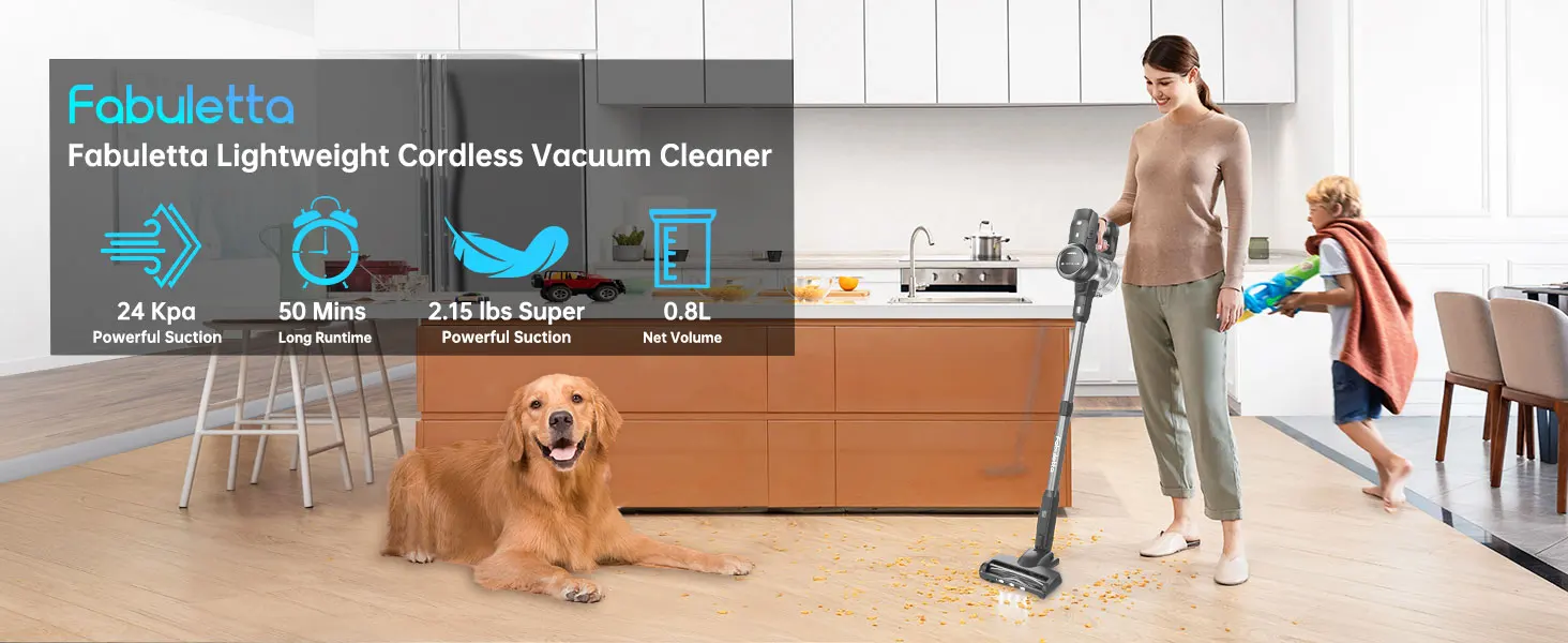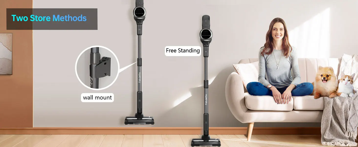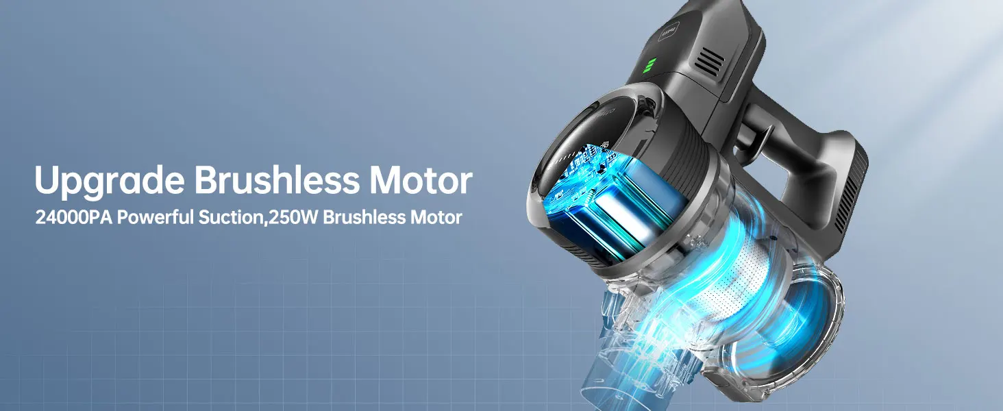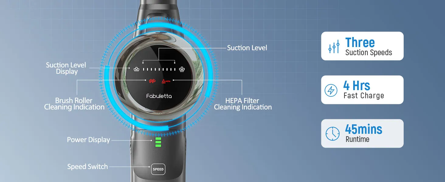 [Powerful Suction with Upgraded Brushless Motor] The FABULETTA FSV001 PRO cordless vacuum cleaner is equipped with a high-performance 250W Brushless Motor, delivering an impressive 24Kpa Strong Suction on MAX mode. Experience three suction modes: Eco Mode (10Kpa), Standard Mode (15Kpa), and Max Mode (24Kpa) to meet your cleaning needs.