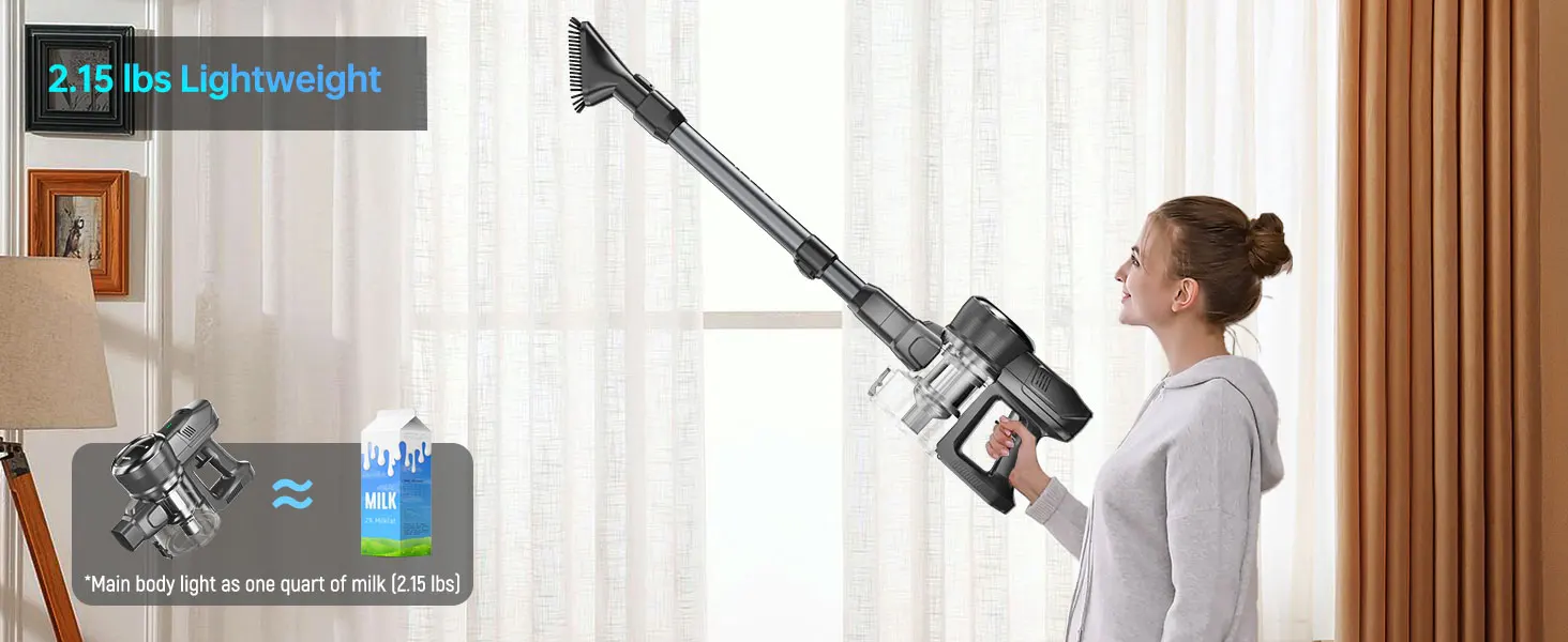 [LED Display and User-Friendly Design] This lightweight cordless stick vacuum weighs only 2.15lbs, making it perfect for one-hand cleaning. The LED display screen shows real-time information such as dust cup fullness, brush clogging warning, and suction mode. The independent LED indicator light on the battery indicates the remaining power. The self-standing design allows you to conveniently place the stick vacuum anywhere and free your hands whenever needed.