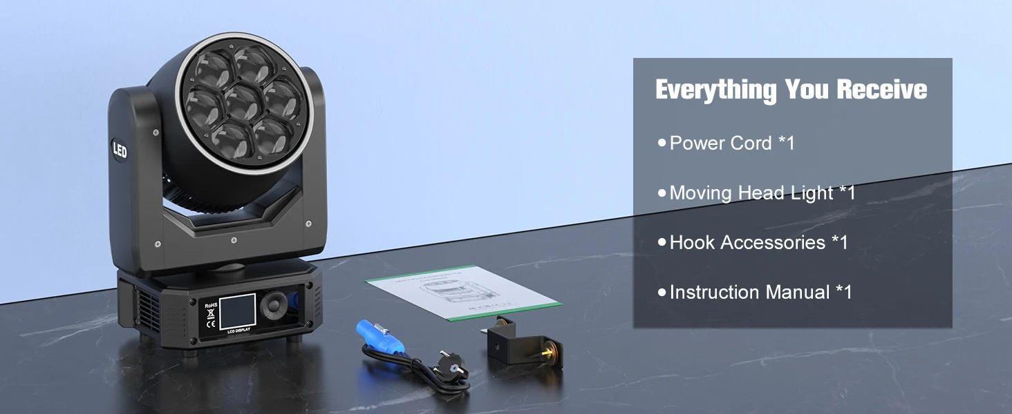 7-inch LCD screen for intuitive operation, with sound-activated, auto modes, and DMX512/master-slave support—no programming needed!