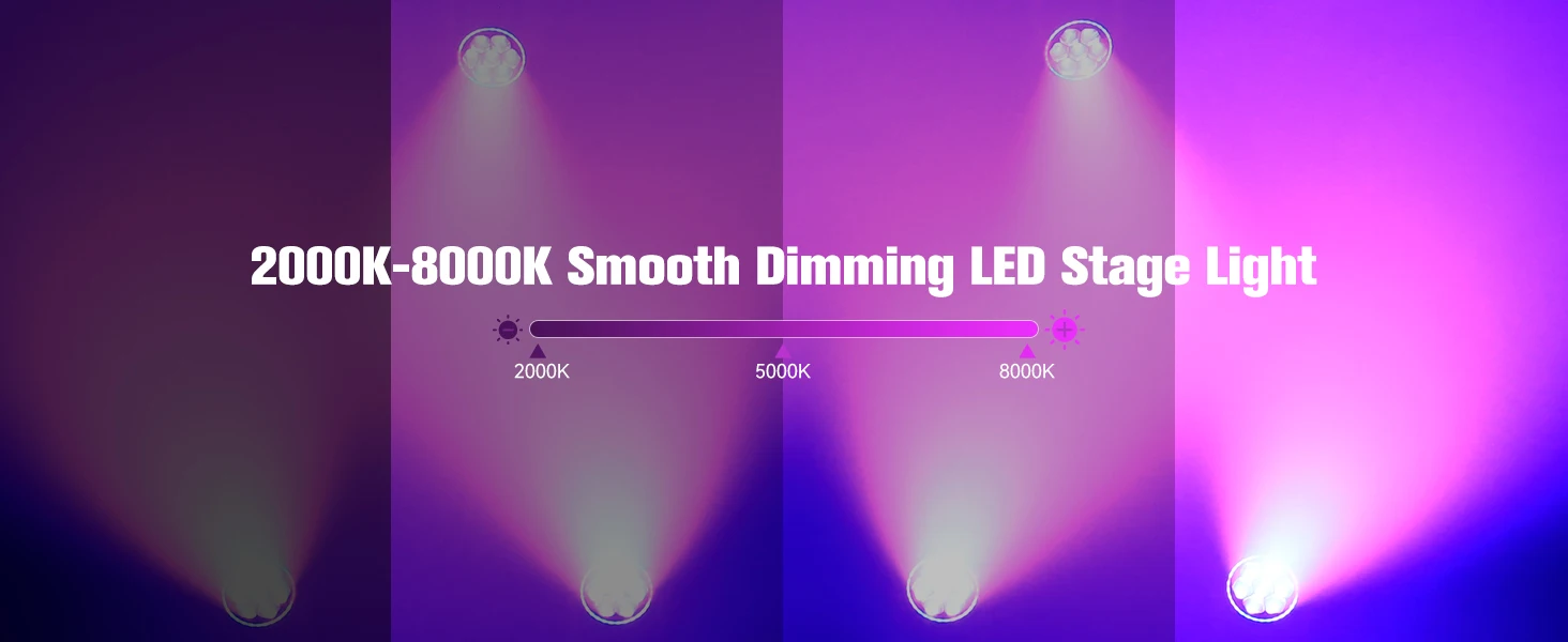 Features 2000K-8000K linear CCT adjustment, color washing, beam, vortex, kaleidoscope, and electronic linear focus.