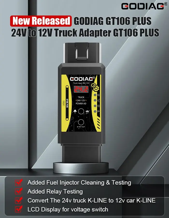 GODIAG GT106 PLUS heavy truck power module converter can convert heavy truck diagnostic interface from 24v to 12v, used for X431 easydiag 3.0, easydiag 2.0, Golo Carcare 3, ICARSCAN golo technician box, ThinkCar, Thinkcar2, Thinkcar pro, Thinkdiag, Thinkdiag mini, Thinkdriver obd2 diagnostic Bluetooth head for truck diagnosis. What's more, GODIAG GT106 PLUS also supports fuel injector cleaning & testing and relay testing for both cars and heavy duty trucks.