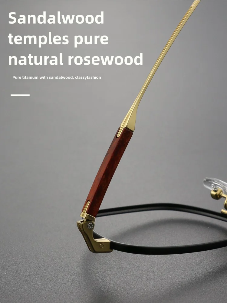 This product is a pure titanium eyeglass frame with sandalwood inlays on the temple arms. The craftsmanship is exquisite, showcasing great artistry, m…