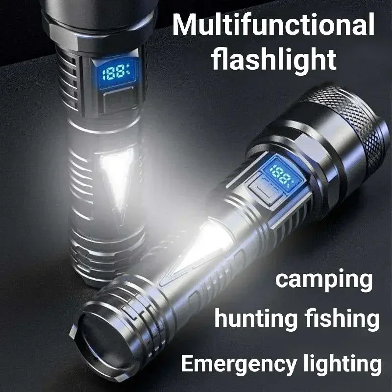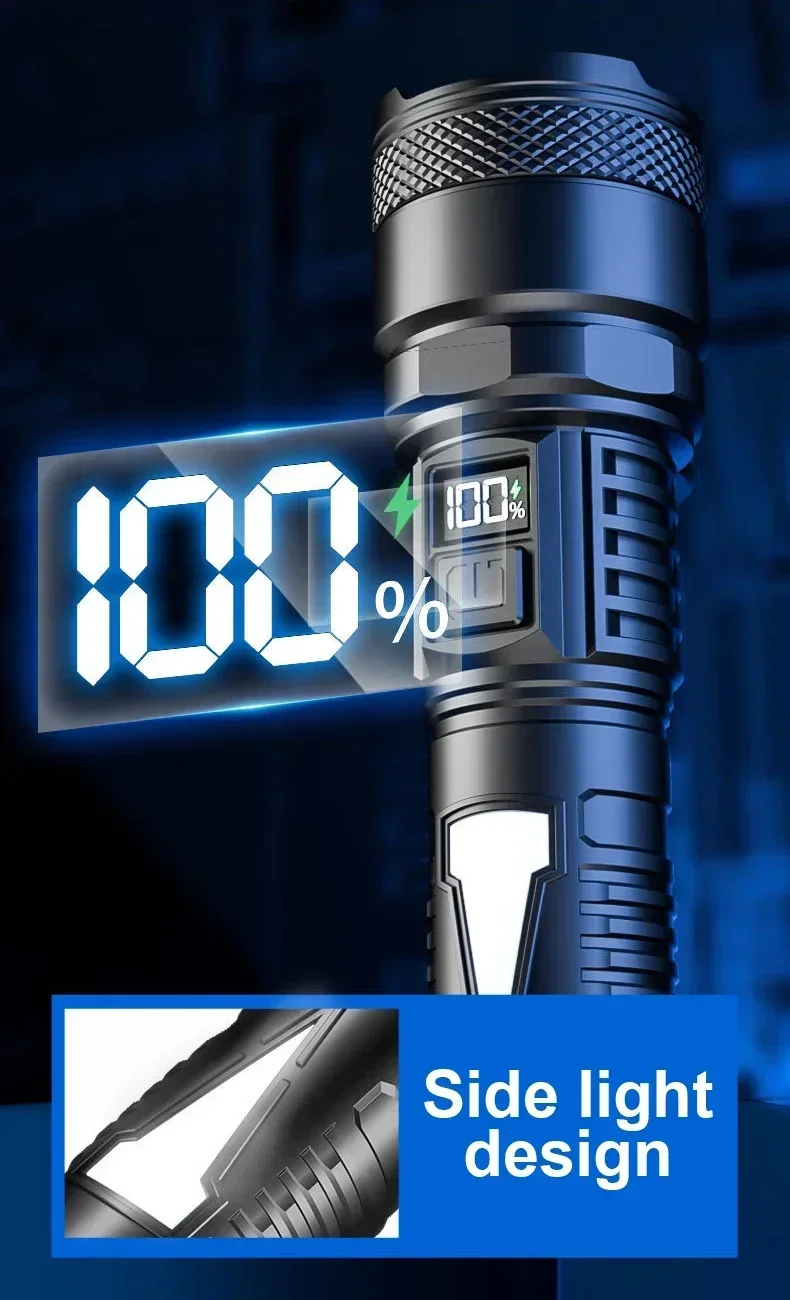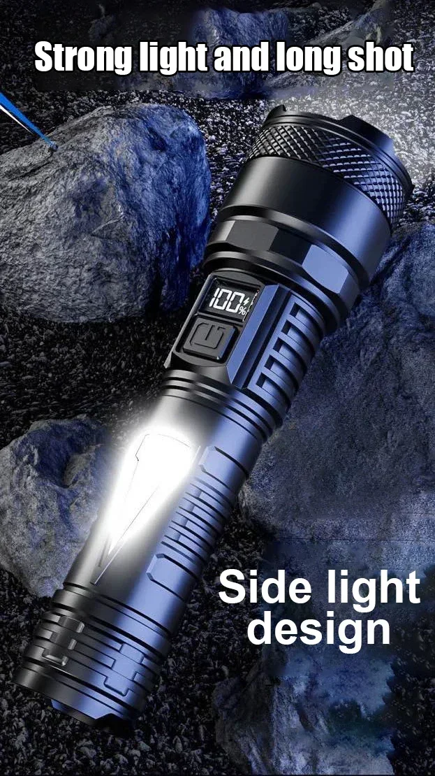 < COB side light for wider and brighter illumination :The flashlight has a COB side light that provides wider and brighter illumination, making it ideal for exploring dark areas or working in low-light conditions,COB side lights are equipped with super bright light