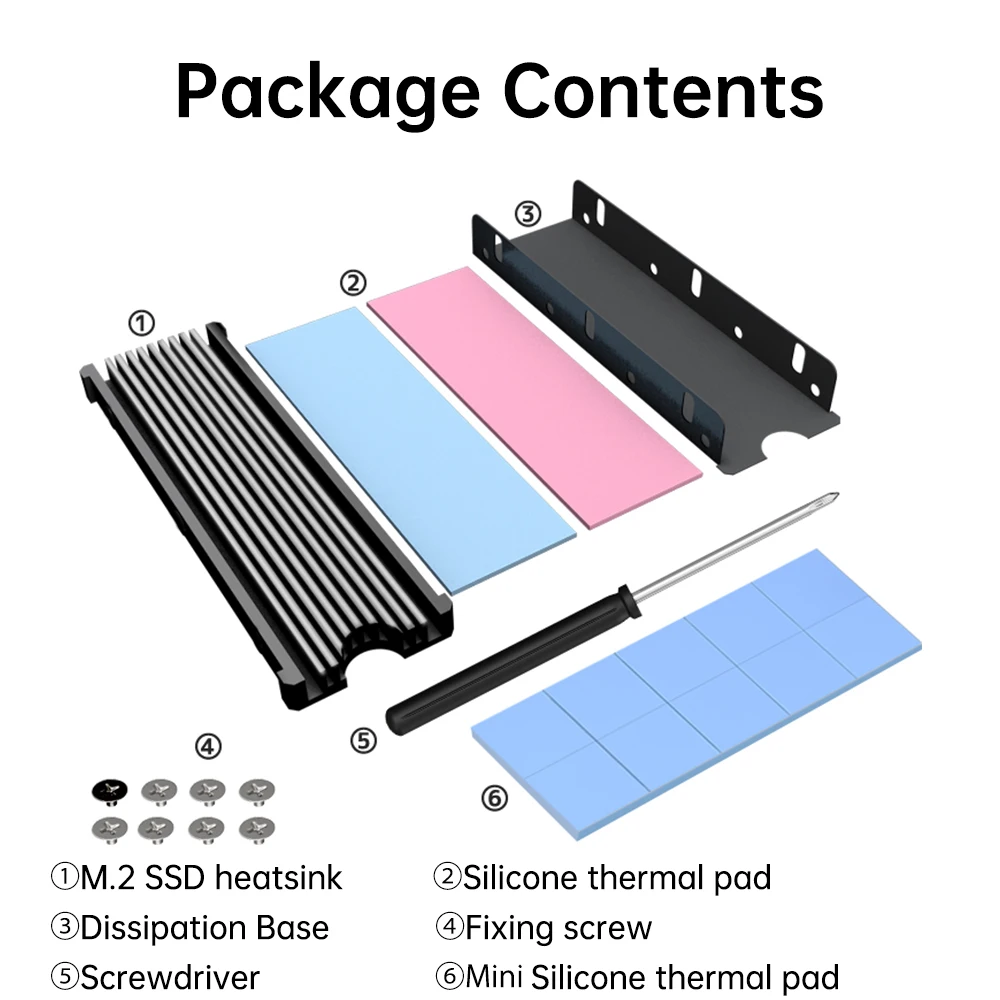 【Package Contents】- 1 x JEYI M.2 Heatsink, 3 x Silicone thermal pads, 8 x Fixing screws, 1 x Screwdriver