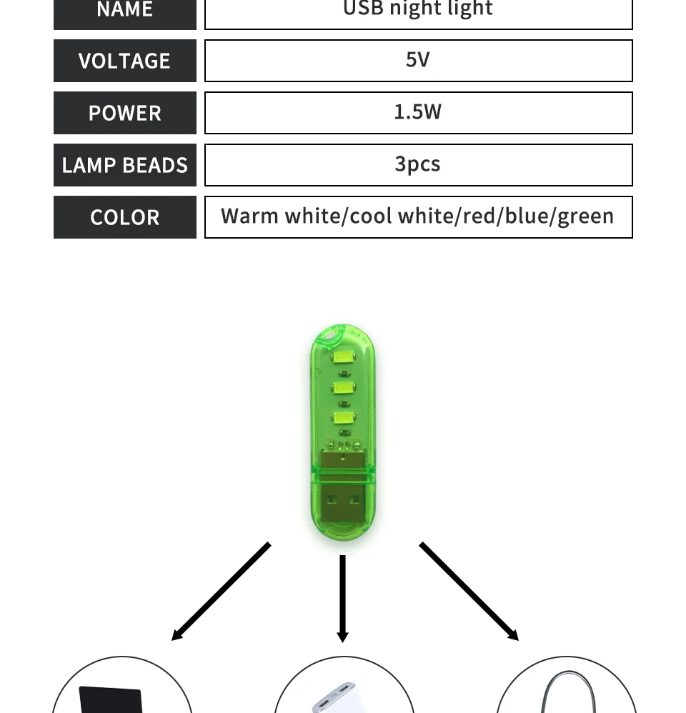 Name: usb night lightVoltage: 5VPower: 1.5WLED lamp beads: 3ledsColor: red/blue/green/warm white/cool whiteWays to use: power bank, computer usb port,…