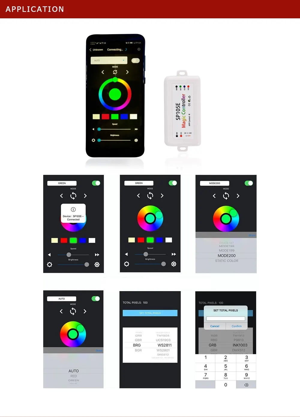 Products Description:1.SP105E(Bluetooth Led Controller)SP105E Specifications:Bluetooth led controllerSupport Pixels Number: Max 2048PixelsWorking temp…