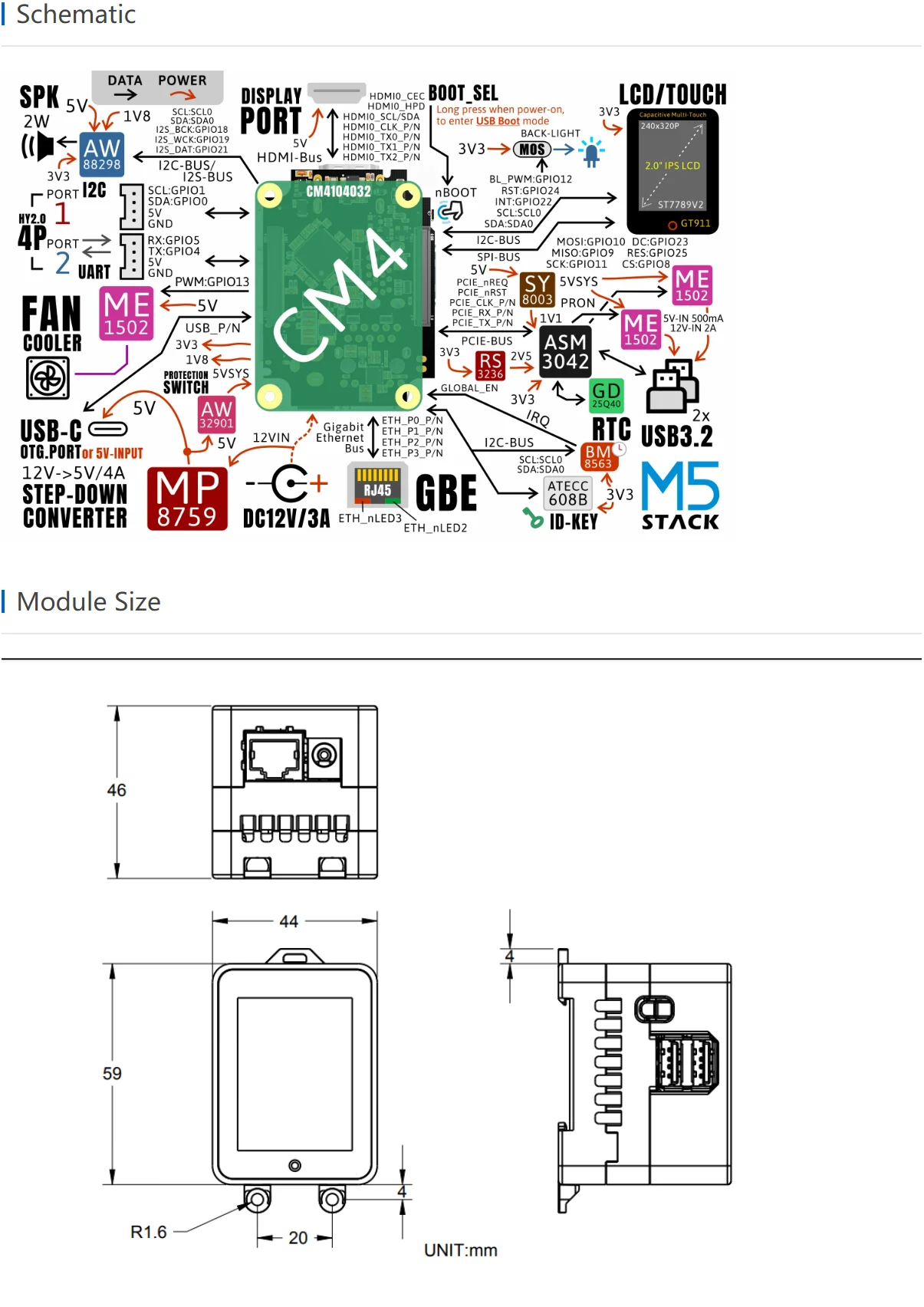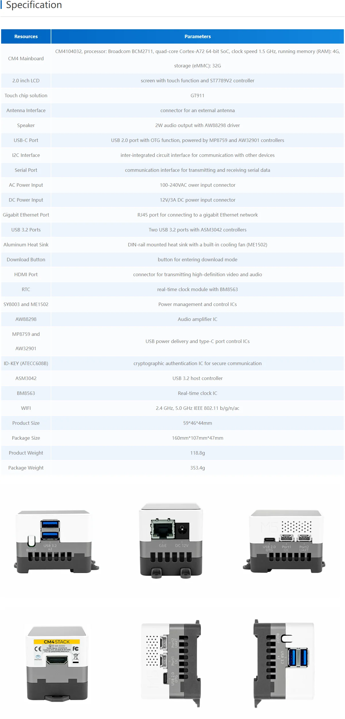 CM4STACK is an integrated micro host based on the Raspberry Pi CM4 core board, using the CM4104032 module with built-in WiFi, 4GB of memory, and 32GB eMMC. The host includes rich peripheral devices: a 2.0-inch IPS-LCD screen with capacitive touch, with a resolution of 320x240; 2 USB3.2-A ports (pcie+ASM3042); a USB-C (2.0) interface that supports OTG and host power supply; 1 HDMI interface; 1 Gigabit Ethernet interface (RJ45); 1 DC-JACK DC power input interface (12V@3A); 2 HY2.0-4P expansion ports, which are I2C and UART interfaces respectively; built-in 2W speakers, equipped with AW88298 16-Bits I2S amplifier; 1 ATECC608B security encryption chip; 1 RTC chip BM8563; built-in active cooling fan and aluminum alloy heat sink frame. This product supports DIN rail, wall hanging, and screw fixing methods in structure, and is suitable for industrial automation, smart homes, and IoT fields.
