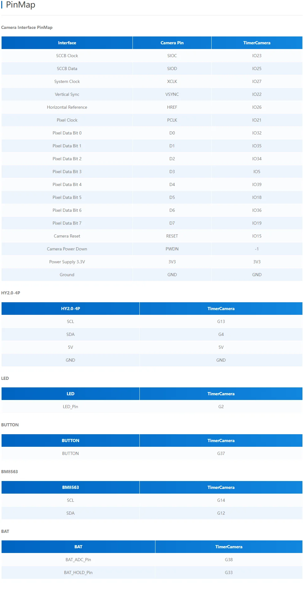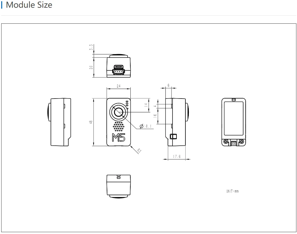 The Timer Camera F is a fisheye camera module based on ESP32-D0WDQ6-V3 with 8M PSRAM and 4M Flash on board. 3.0 megapixel camera (OV3660) with DFOV 120° and a maximum resolution of 2048x1536 photos can be captured. The camera features an ultra-low-power design, and the internal integrated RTC (BM8563) draws out the IRQ signal, which can be used for sleep and timer wake-up (sleep current down to 2μA). The built-in 270mAh battery provides more than one month of battery life with timed pictures (one per hour) enabled. The module supports WiFi image transfer and USB port debugging, and the HY2.0-4P output on the bottom can be used to expand other peripherals. The on-board LED status indicator and reset button facilitate program development and debugging. In terms of application, M5Stack provides a number of simple and efficient application development methods and interfaces for the TimerCAM series, making it easy for users to use and develop their applications. (including PC/Mobile photo shooting APP, cloud image HTTP interface for timer shooting, cloud AI recognition interface (not online yet), etc.)