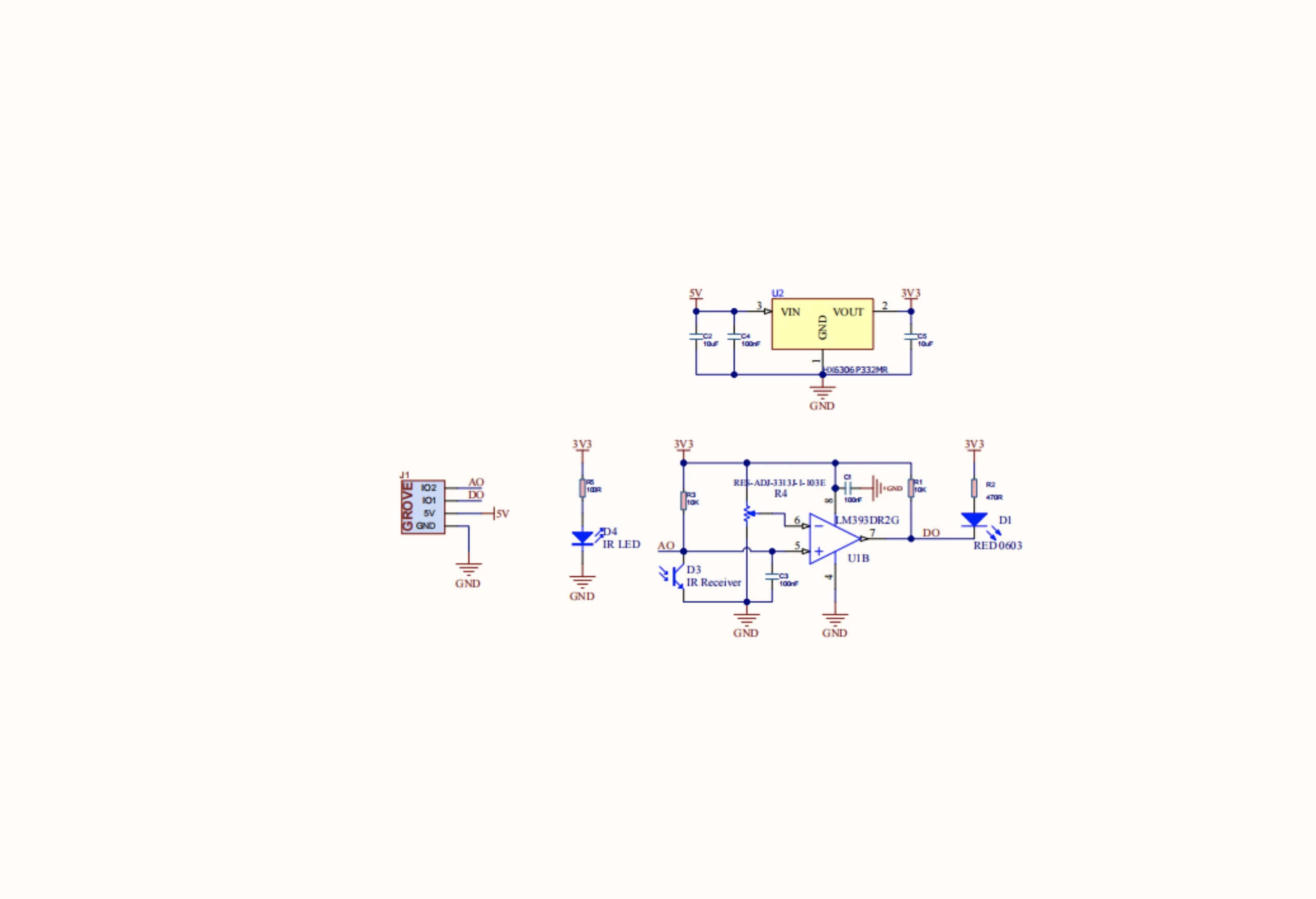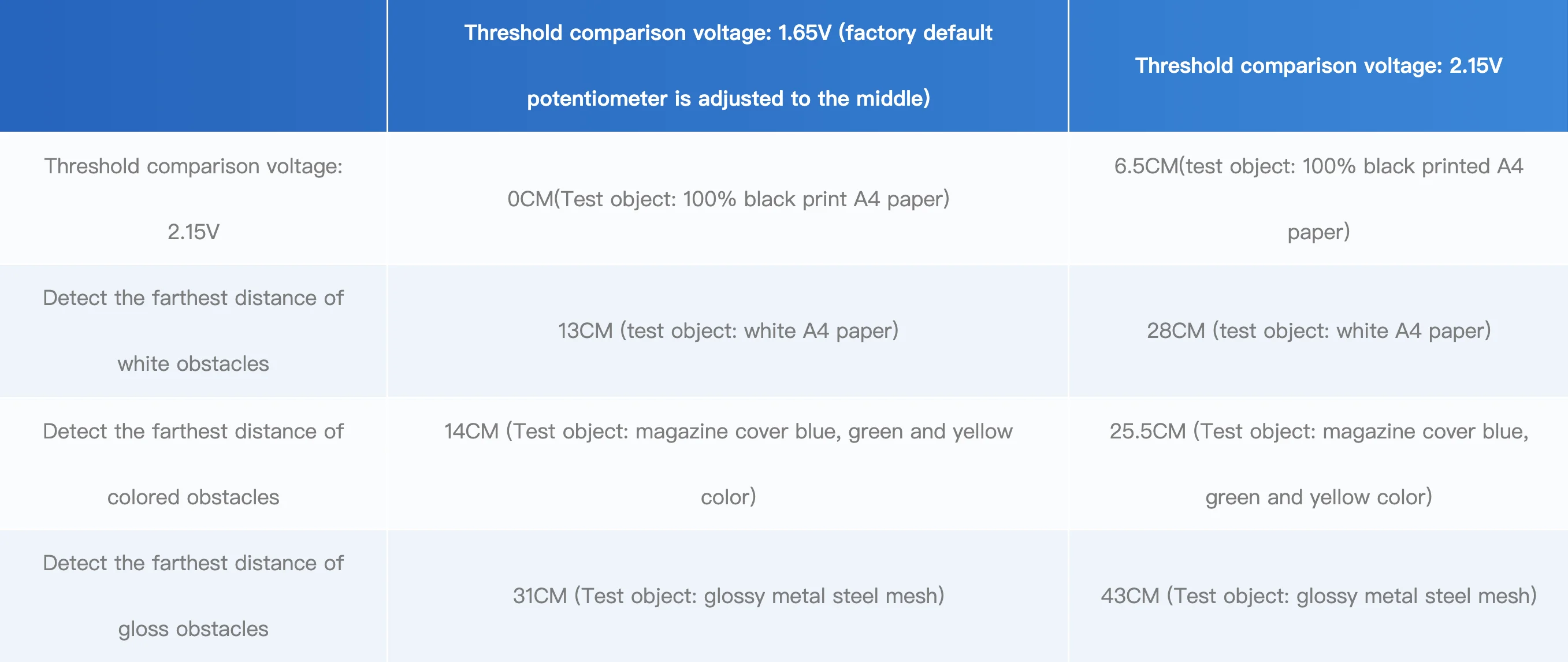 * Analog signal output: Through the infrared receiving tube and 10k resistor voltage division, the corresponding voltage value is generated according to the intensity of the infrared signal reflected by the obstacle.
