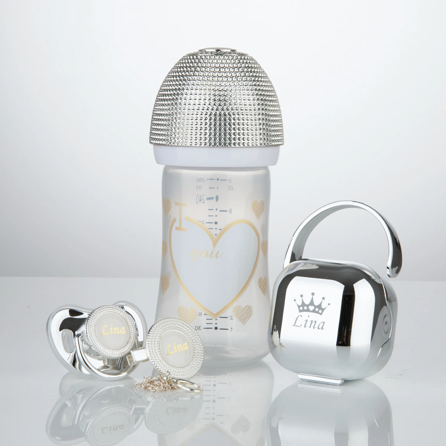 The bling custom pacifier and baby bottle anniversary set is a perfect gift for parents celebrating their baby's milestones. The set features a…