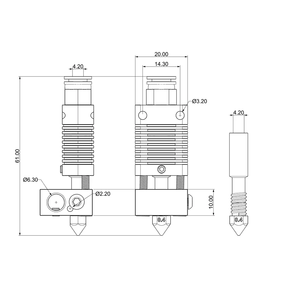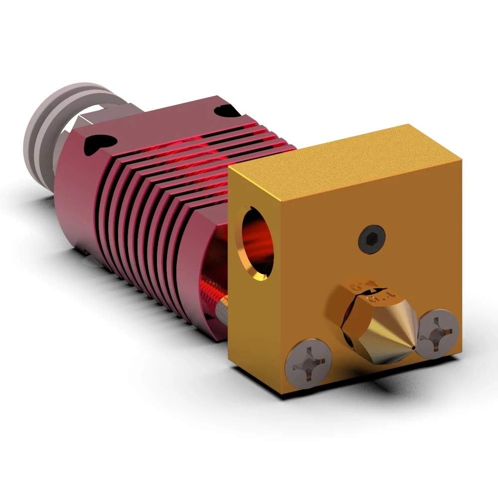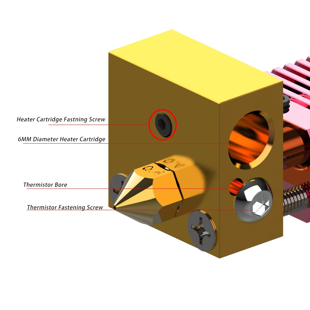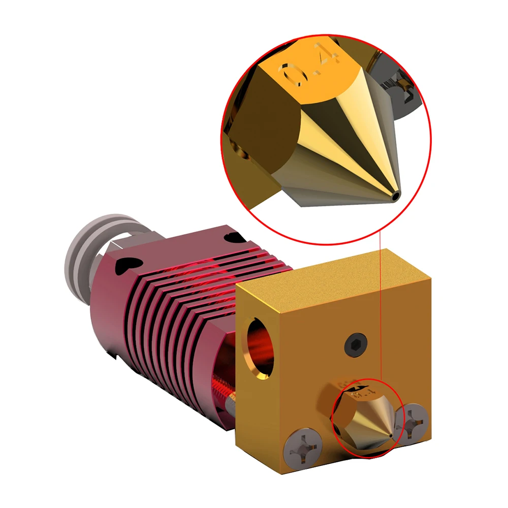 2:This hotend assembly comes with all the necessary parts of heater block, heat break, heat sink, and a 0.4mm Brass Nozzle.