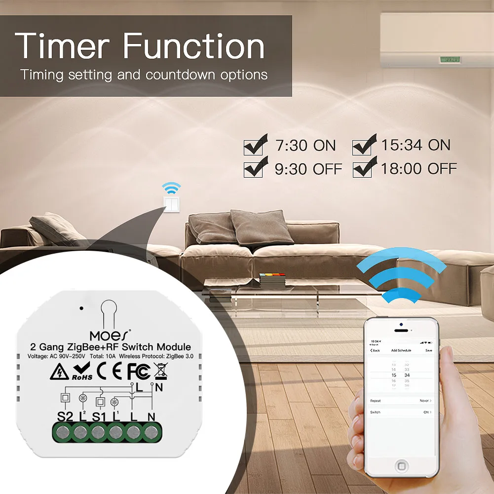2.Can be used as a 1-way or 2-way circuit (2 switches control 1 light); simply connect to 1 of the 2 switches and convert the connected device into a smart one (for 2-way circuit);2.Newly designed with RF frequency for RF remote control in another non-interfering mode.