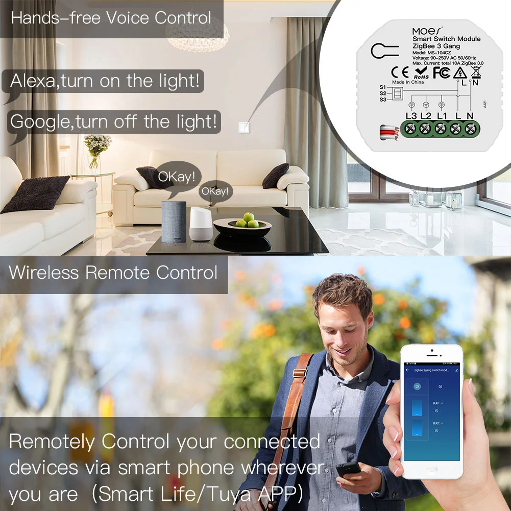 3.Allows for hands-free voice and wireless remote control;support Amazon Alexa Google Home Yandex voice control and Smart Life and Tuya App control on smart phones with special Tuya ZigBee 3.0 hub required and connected.;0%-100% dimmable for the dimmer switch module;Relay status adjustable when power off.