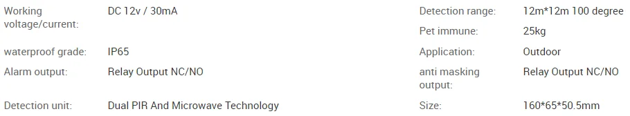 This outdoor waterproof motion sensor is a special three-tech (PIR+PIR+MW) complex detector for outdoor intrusion. Signals of 3 sensors are with super stability and depend-ability by its advanced multi-grades digital signal processing technology. And they can offer 3 different detection modes on 2 sensitive grades in order to choose the best the detection way for spot environment and gets the best rate between the best detection ability and the minimum false alarm rate. With normal “AND”and “OR” modes, also with “EI” mode to avoid the damage of dopes spraying on the lens. Its unique water-proof design is totally fit for outdoor installation. At the same time, also with other functions such as anti masking automatic setting and alarm type memory etc.
