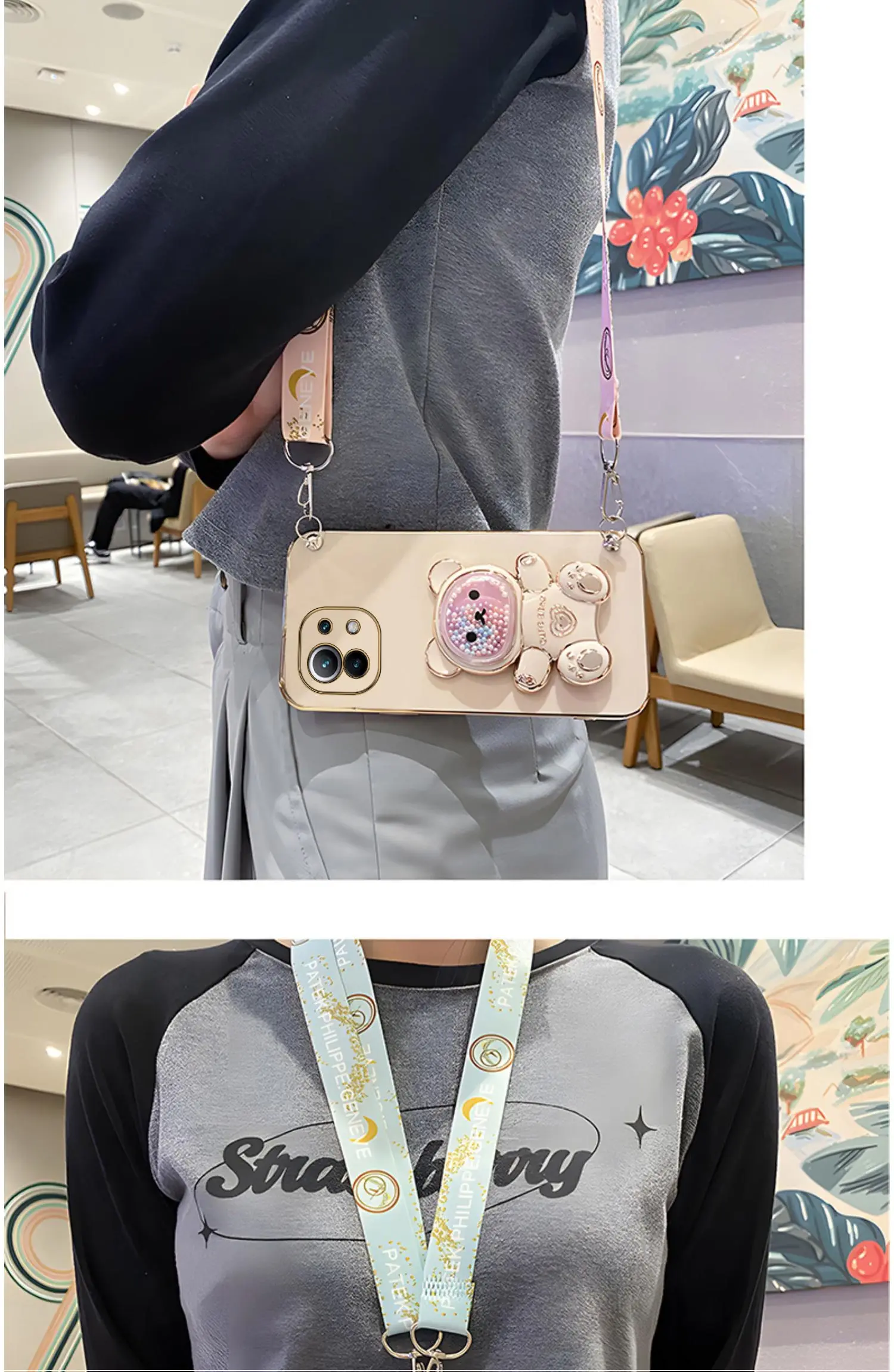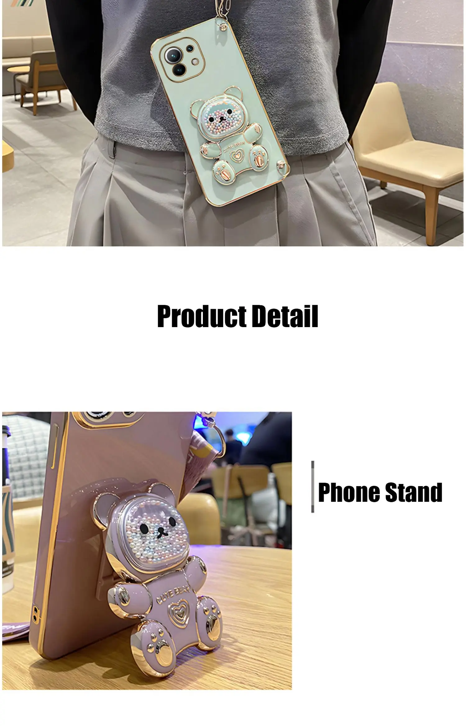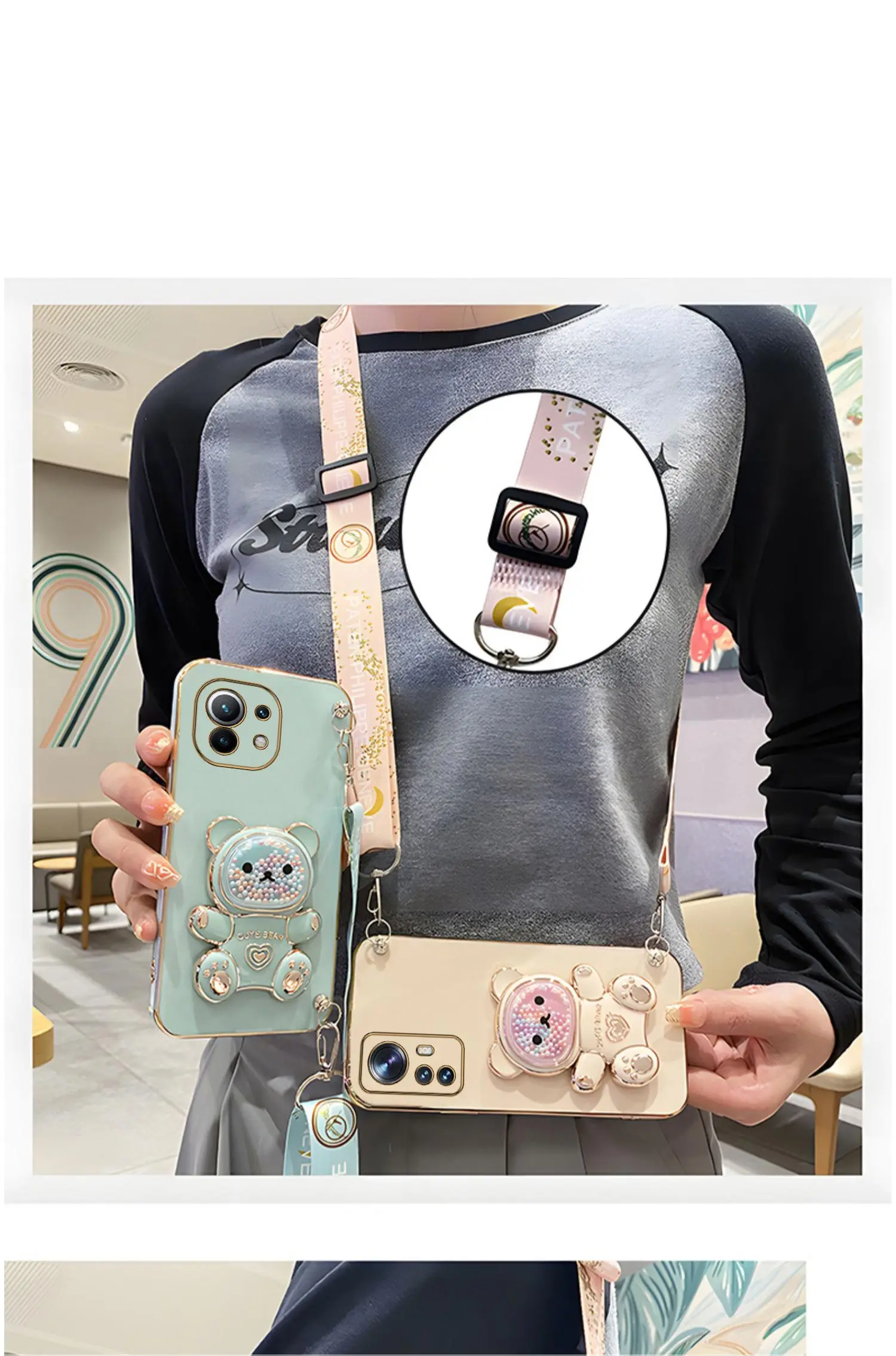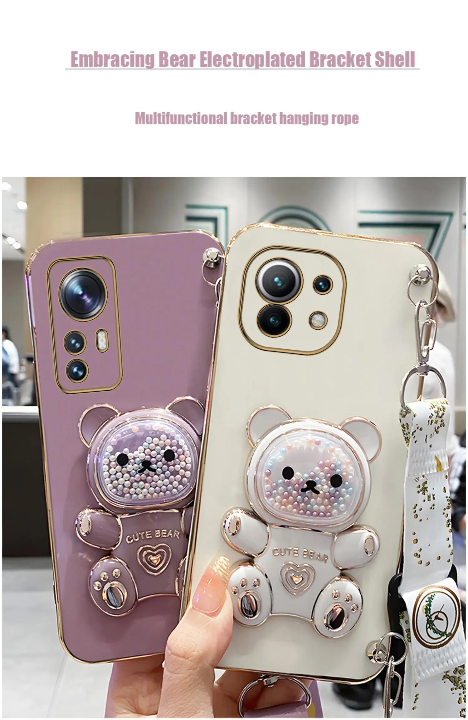 Quicksand Bear Holder Lanyard Phone Case For Xiaomi Mi 12T 11T 12 13 10 11 Lite Mi13 13 Pro 13Lite 5G 8 9 9T Strap Stand CoverCute Quicksand Bear Hold…