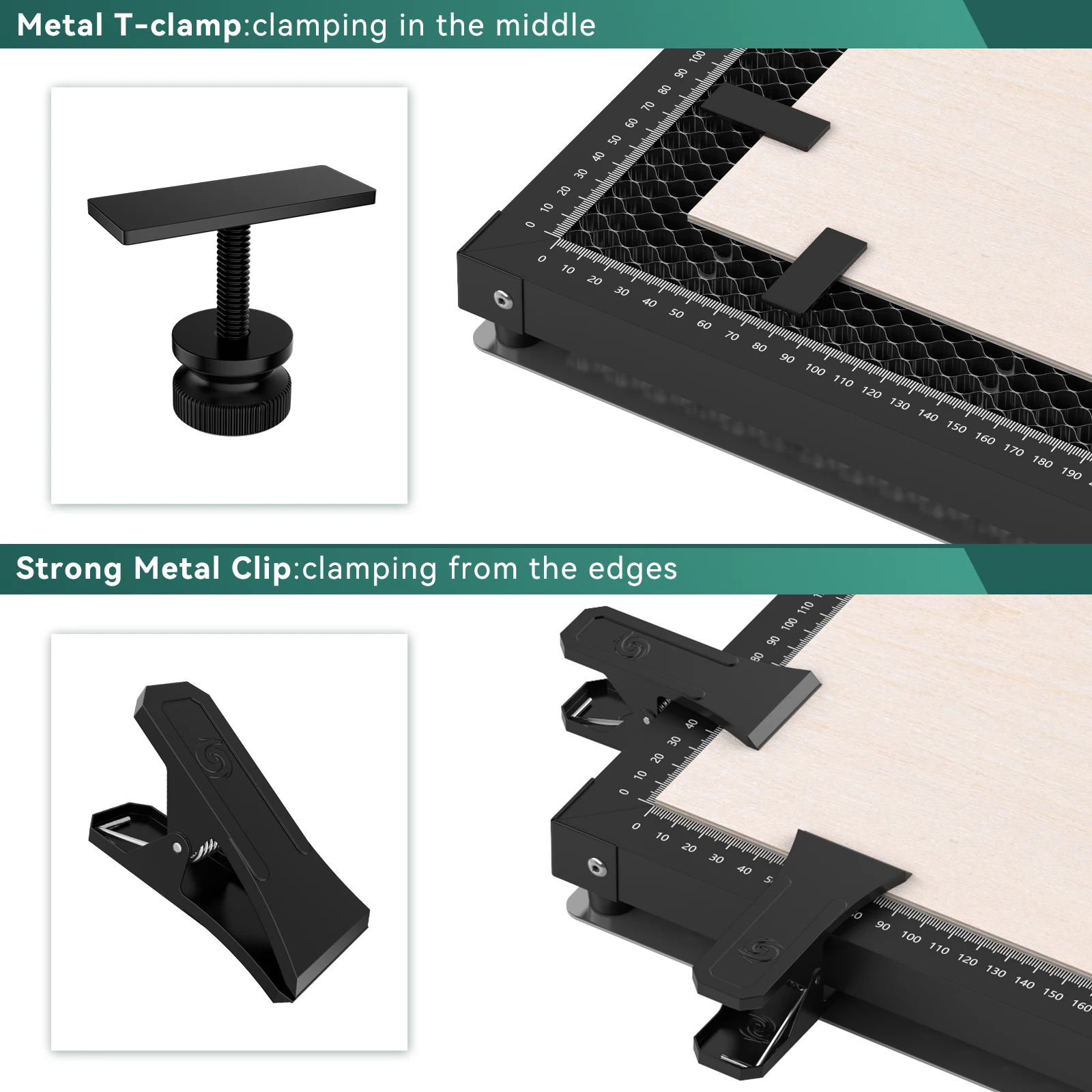 ? Professional metal clamps: SCULPFUN honeycomb panel provides uniquely designed metal clamps, including high-strength metal clamps and T-shaped clamps, which can easily clamp curved wood or even metal plates to keep the carved surface flat.