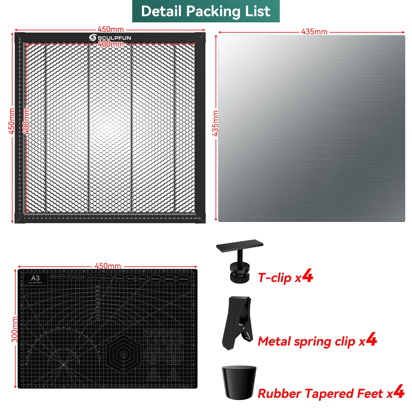 ? Standard 400x400mm honeycomb area: the outer area is 450x450mm, and the working area of the honeycomb area is 400x400mm, providing you with more effective use area.