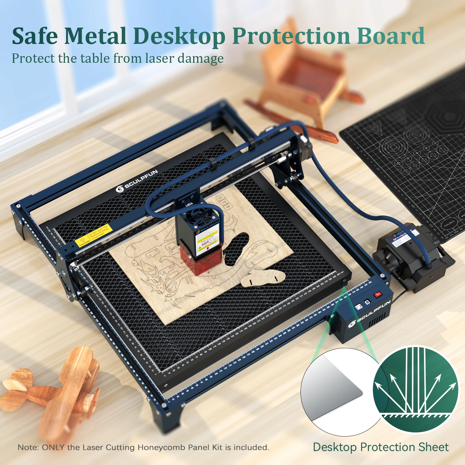 ? Safe metal desktop protection plate: SCULPFUN honeycomb panel is equipped with a metal desktop protection plate, which can protect the table from laser damage, which is very suitable for small DIY diode lasers.